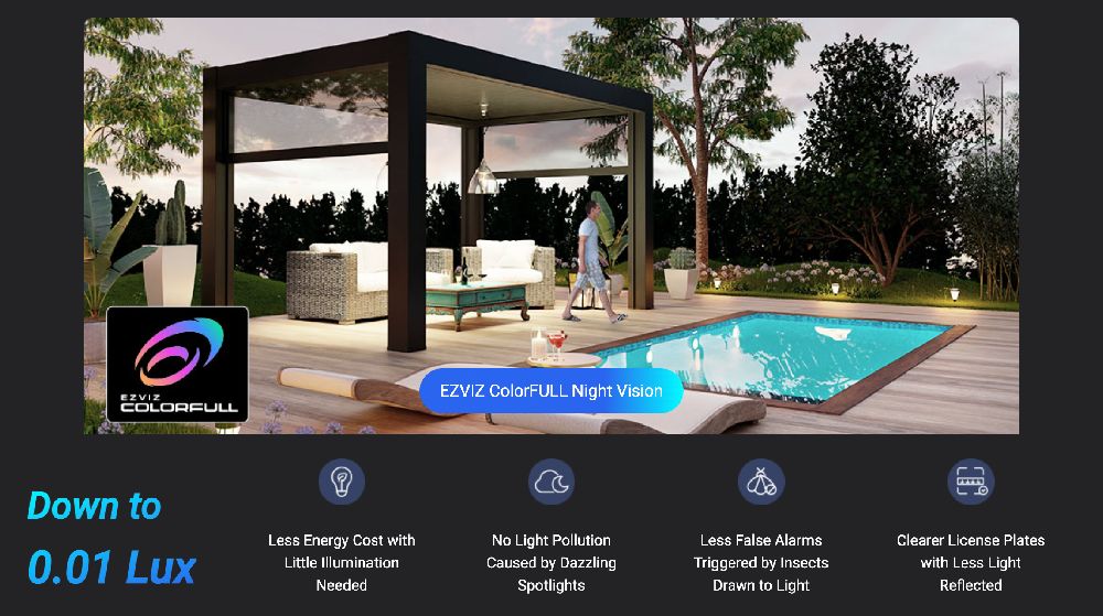 Full-colour vision, even at night. Powered by EZVIZ’s innovative ColorFULL technology, the camera captures vivid, natural-looking colour details after dark, even when all lights are off.