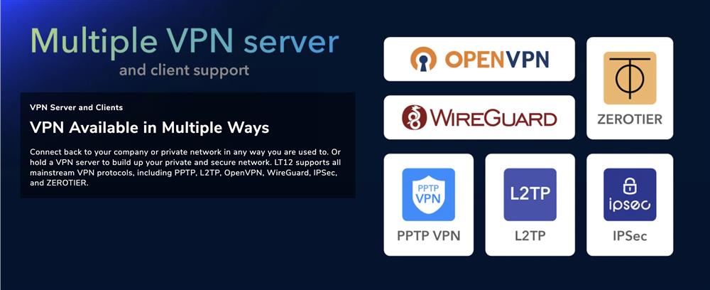 - PPTP/L2TP/OpenVPN/WireGuard/IPSec/Zerotier VPN