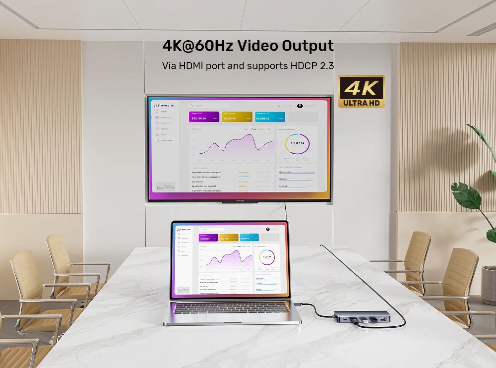 The Unitek hub supports 4K@60Hz Ultra HD video output via its HDMI port, compatible with HDCP 2.3 specifications. Enjoy smooth, high-definition visuals on external displays, perfect for presentations, creative projects, or entertainment, ensuring vibrant and detailed imagery for professional or personal use.