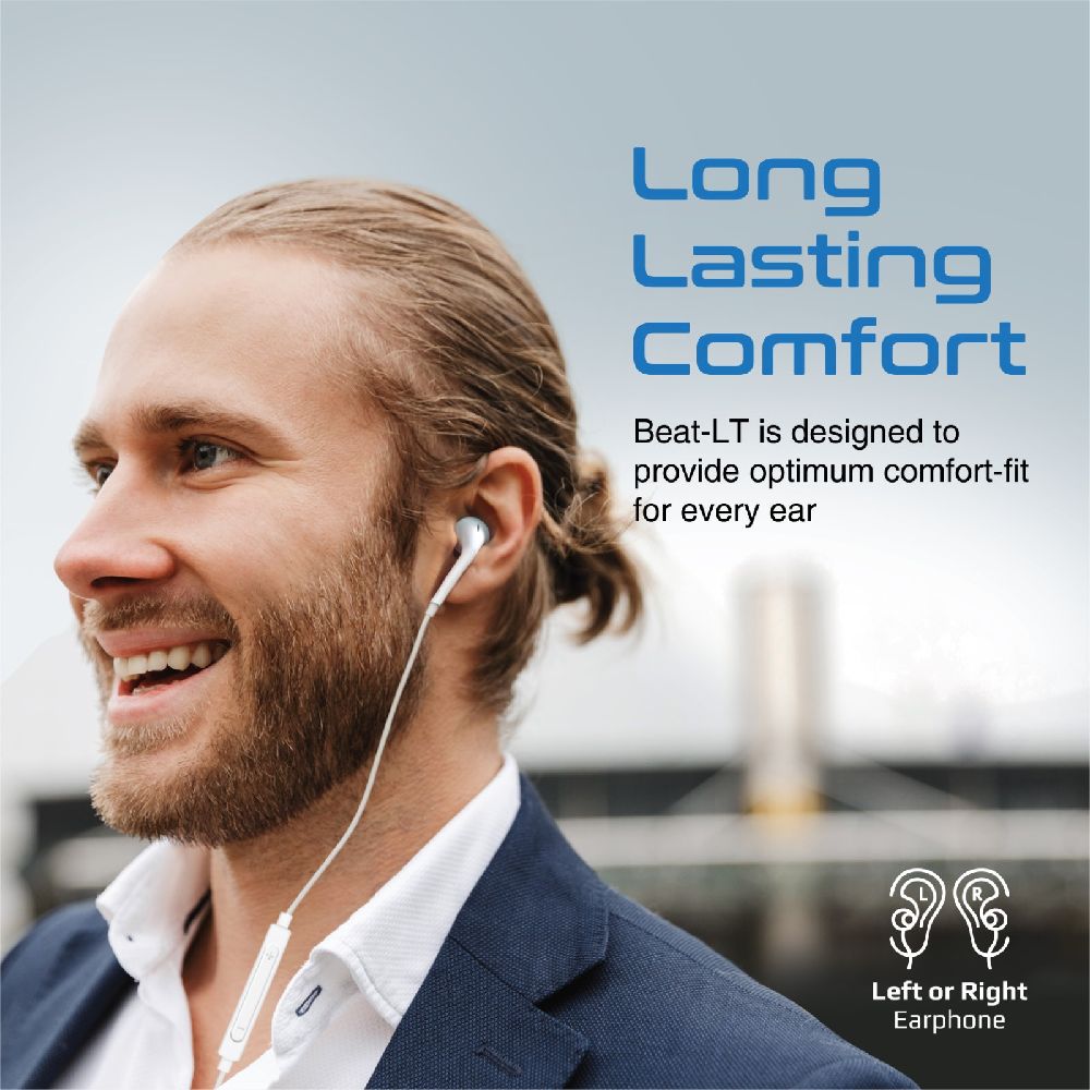 Beat-LT is an in-ear stereo earphone designed to provide rich & balanced audio. Engage in crystal clear calls with the call button & built-in mic. Control your music playback as well as the volume using the in-line remote. A must-have for every professional