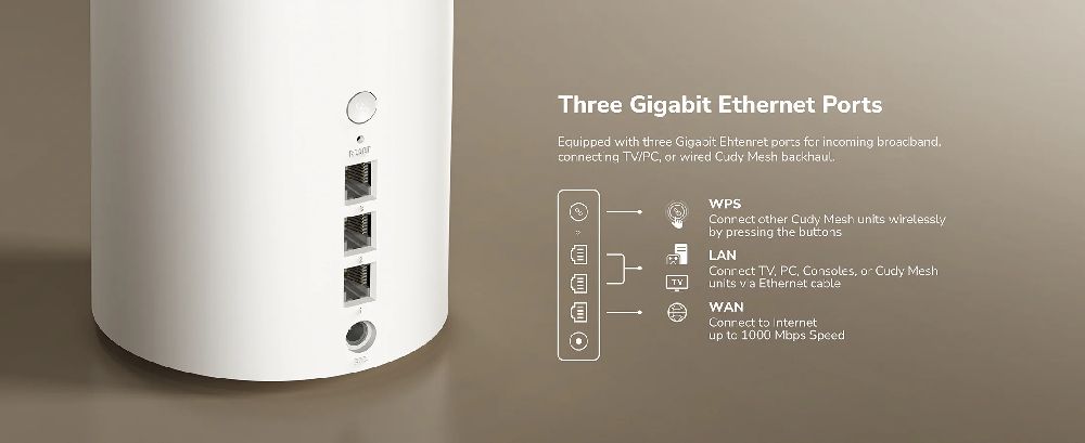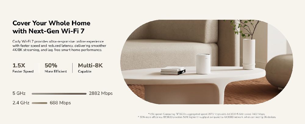 A dual-band WiFi 7 router with an aggregate of 3.6 Gbps speed and three Gigabit ports, catering to a large home with Gigabit Internet access.