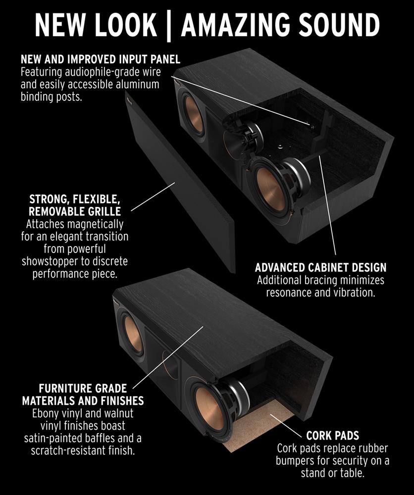 Finishes include ebony vinyl and walnut vinyl that boast satin-painted baffles with a scratch-resistant finish.