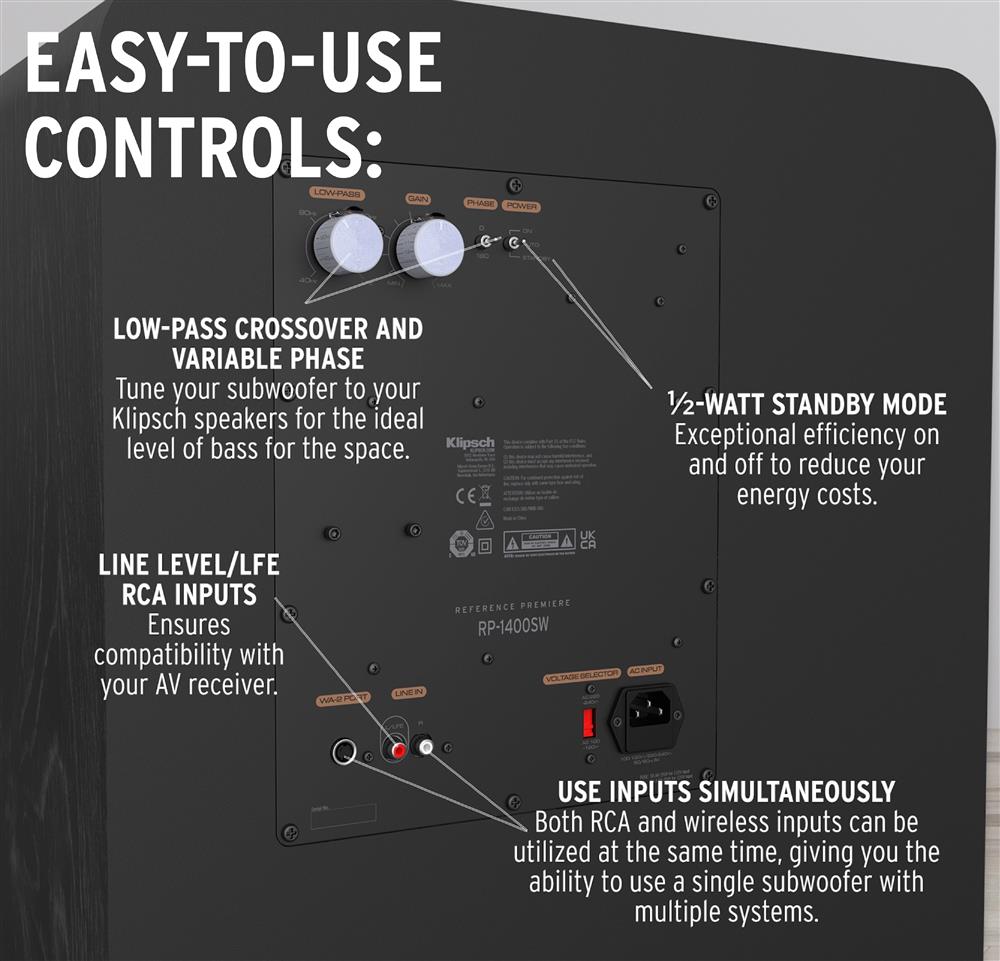 Low Pass Crossover and Variable Phase control allow you to tune the subwoofer to your Klipsch speakers and to your room, establishing the ideal level of bass. Line Level / LFE RCA inputs ensure compatibility with home theatre receivers.