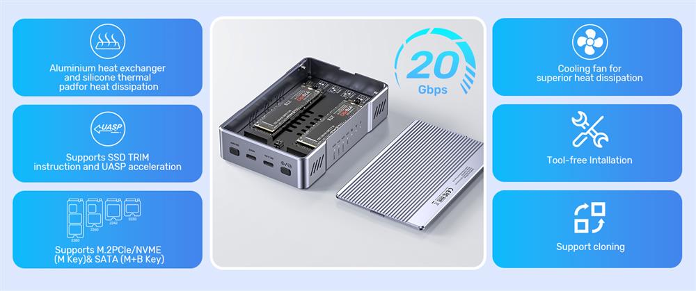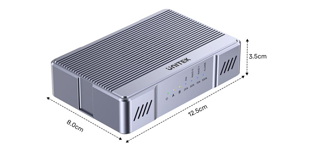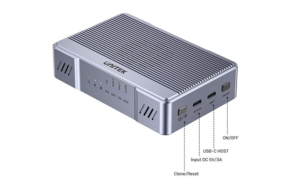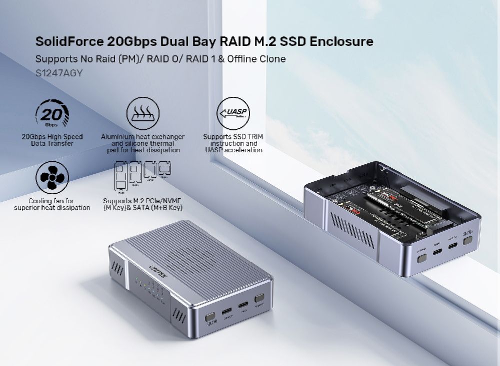 UNITEK SolidForce 20Gbps Dual Bay RAID M.2 SSD Enclosure is not only a dual M.2 SSD enclosure but also supports RAID features with simple mode settings. One-button control enables seamless SSD duplication without a PC or laptop connection. It is an ideal choice for personal storage at home and in the office.