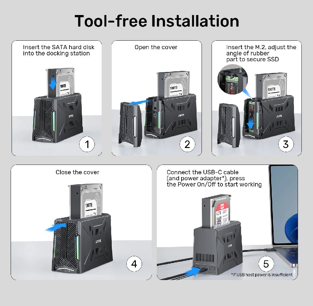 Installing your drives in the UNITEK USB-C Enclosure Docking Station is a breeze with its tool-free design. Simply insert the SATA hard disk into the docking station, open the cover, and then insert the M.2 drive, adjusting the rubber part to secure it in place. After closing the cover, connect the USB-C cable and the power adapter if needed, then press the power on/off button to start working. This straightforward process allows for efficient setup, enabling you to get your drives up and running in no time.