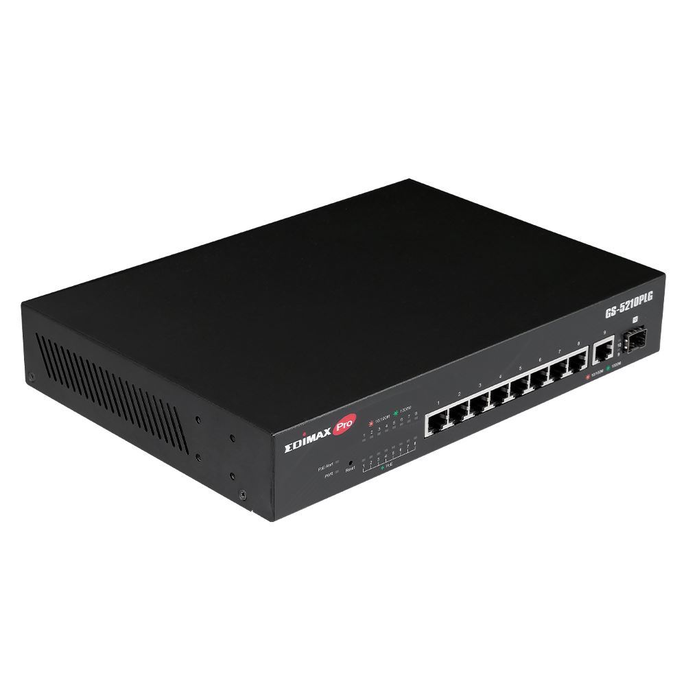 The EDIMAX Pro GS-5210PLG is a web-smart switch with 8 Gigabit PoE+, 1 RJ45 Gigabit uplink port and 1 Gigabit SFP uplink port. Designed for medium to small network environments, its standard 19-inch 1U rack-mount brackets allow for integration with the most widely used mounting systems on the market. The EDIMAX GS-5210PLG is a superb choice to boost your network environment’s performance and efficiency.