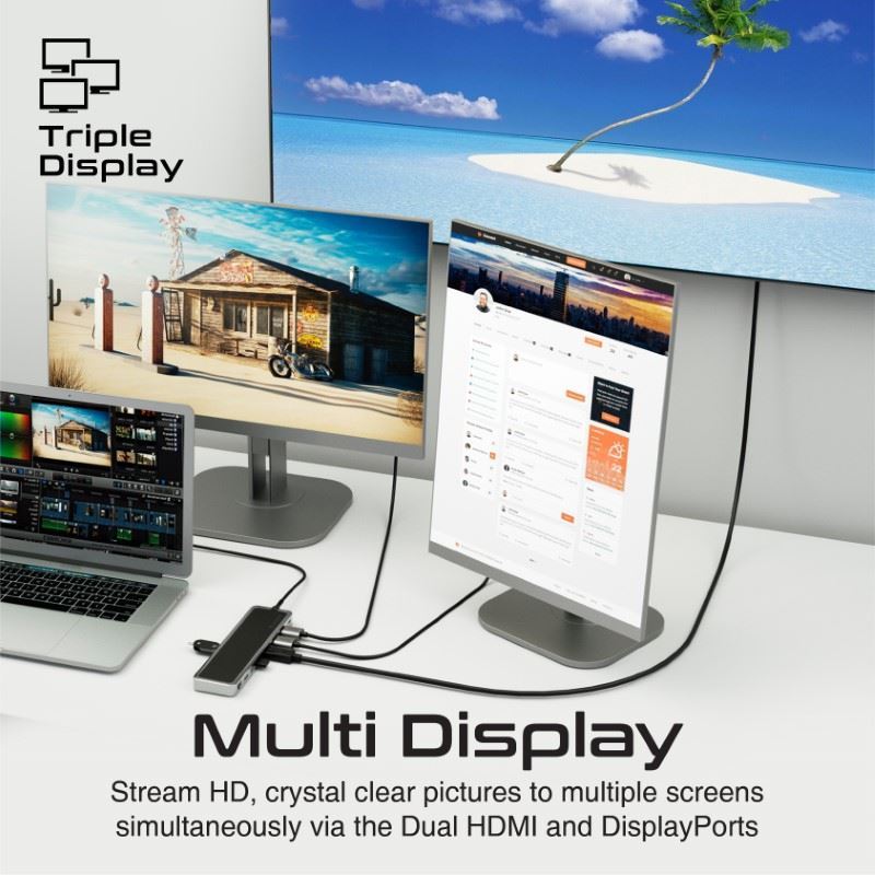 - Multi Display (MST) - Stream HD, crystal clear pictures to multiple screens simultaneously via the Dual HDMI and DisplayPorts