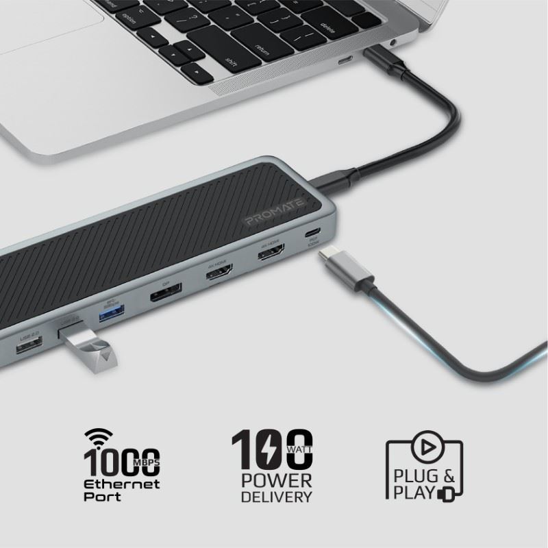 This USB-C hub sports multiple ports, including USB-C power delivery port, ethernet port, Dual 4K HDMI, USB 3.0, USB 2.0, Ethernet, AUX and SD/TF card slots. Stream high-definition, crystal clear pictures to multiple screens simultaneously via the Dual HDMI and DisplayPorts. HD movies, photos, and files are transferred in a few seconds as the USB 3.0 ports support a transfer rate of up to 5Gbps.