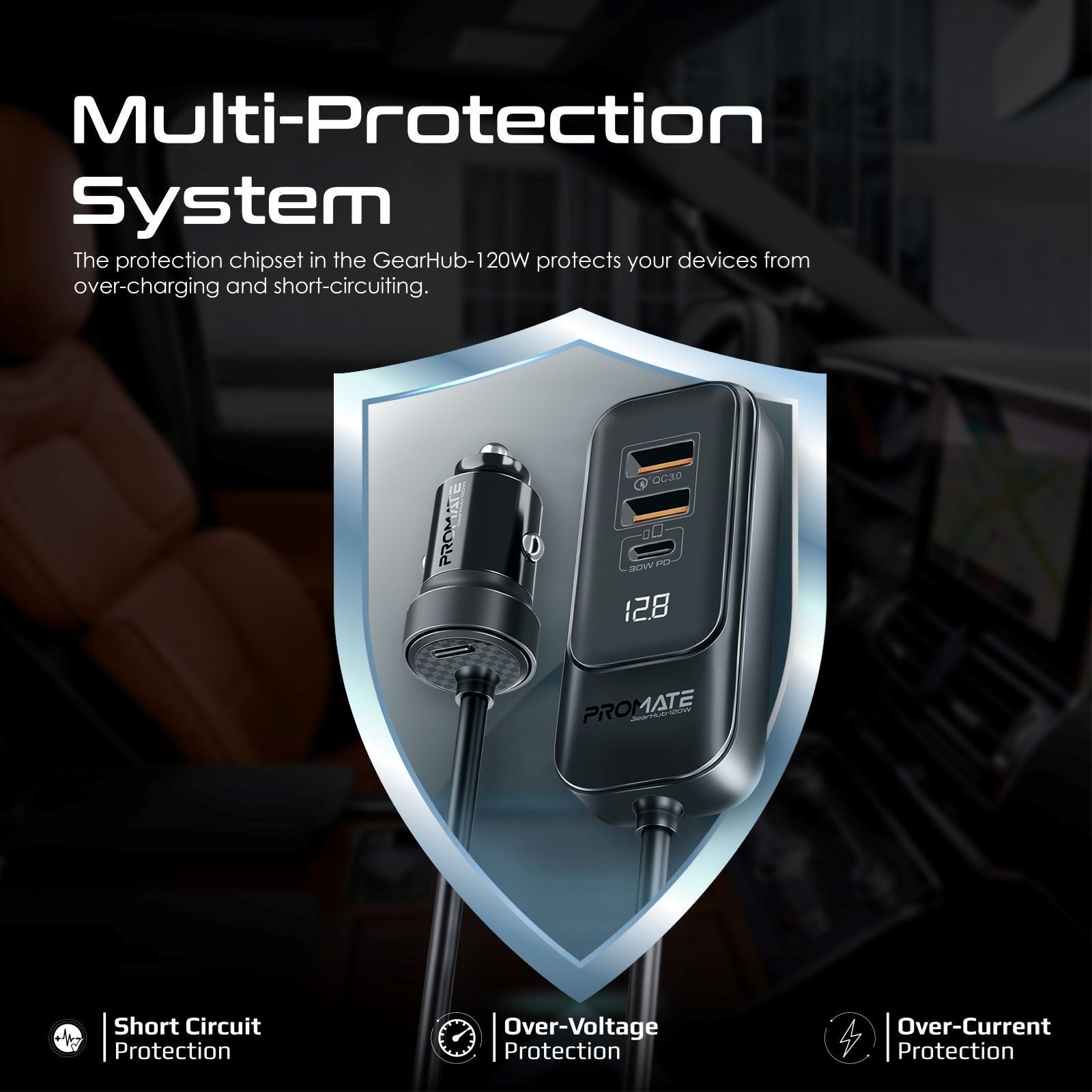 The protection chipset on the GearHub-120W protects your devices so you can enjoy worry-free use while driving. The safety Technology also includes temperature control, surge protection, and short-circuit avoidance.