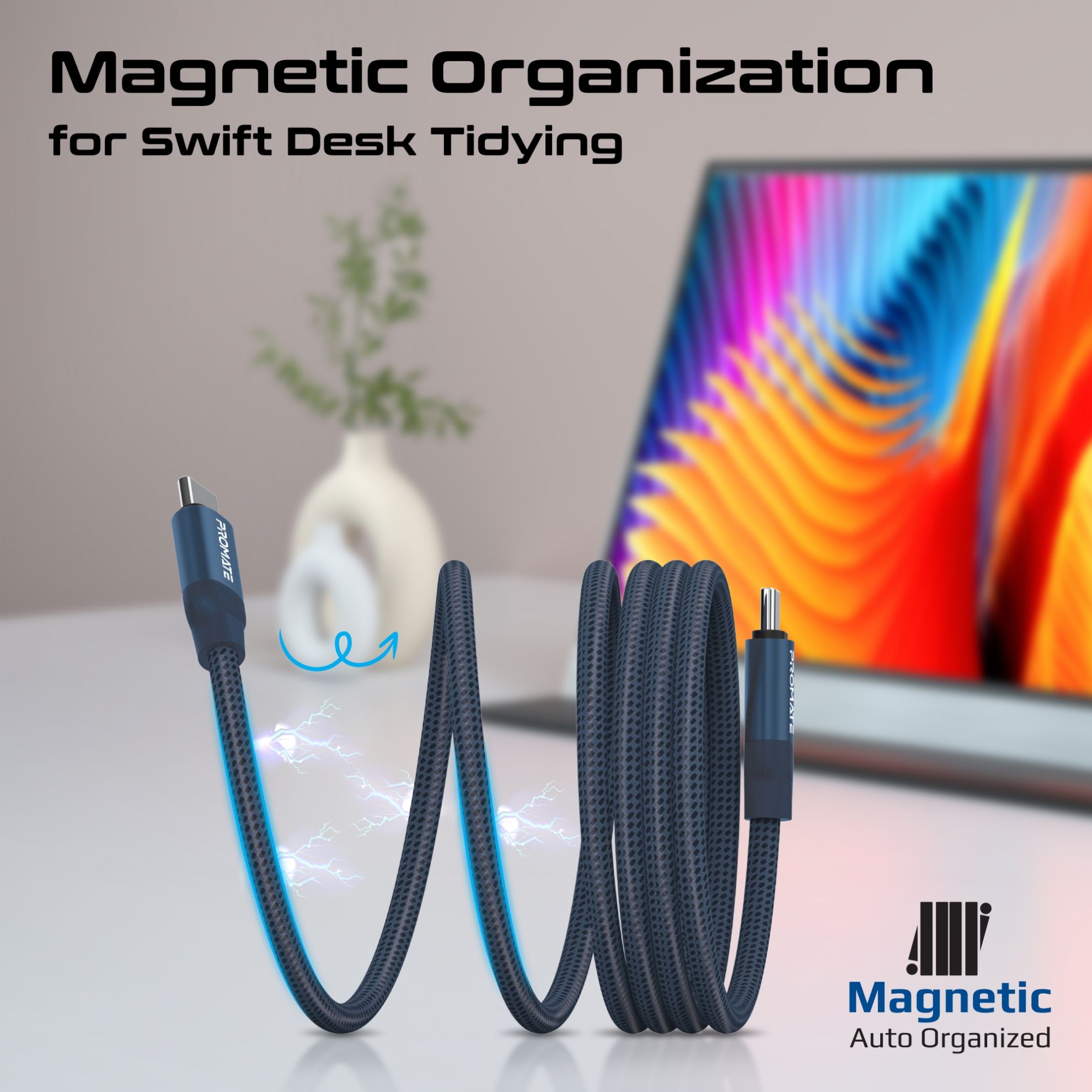 Integrated magnetic functionality allows the cable to self-organise and stay neatly coiled. Attach it to magnetic surfaces or holders to maintain a clean, clutter-free desk, ideal for users managing multiple devices and accessories.
