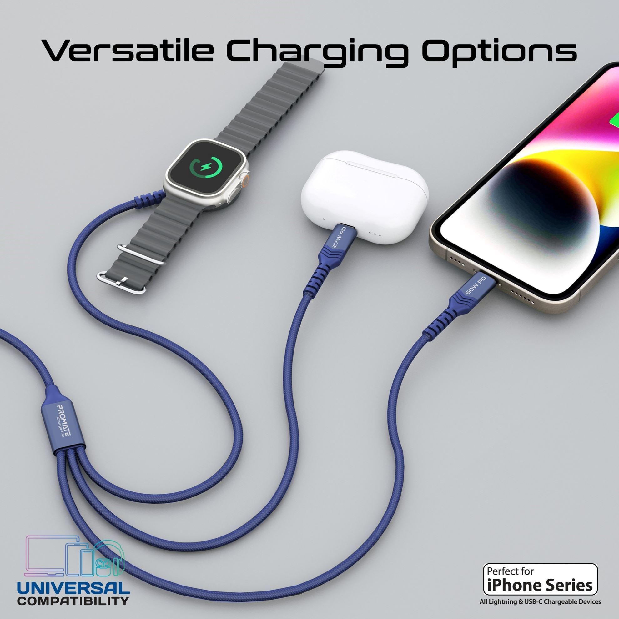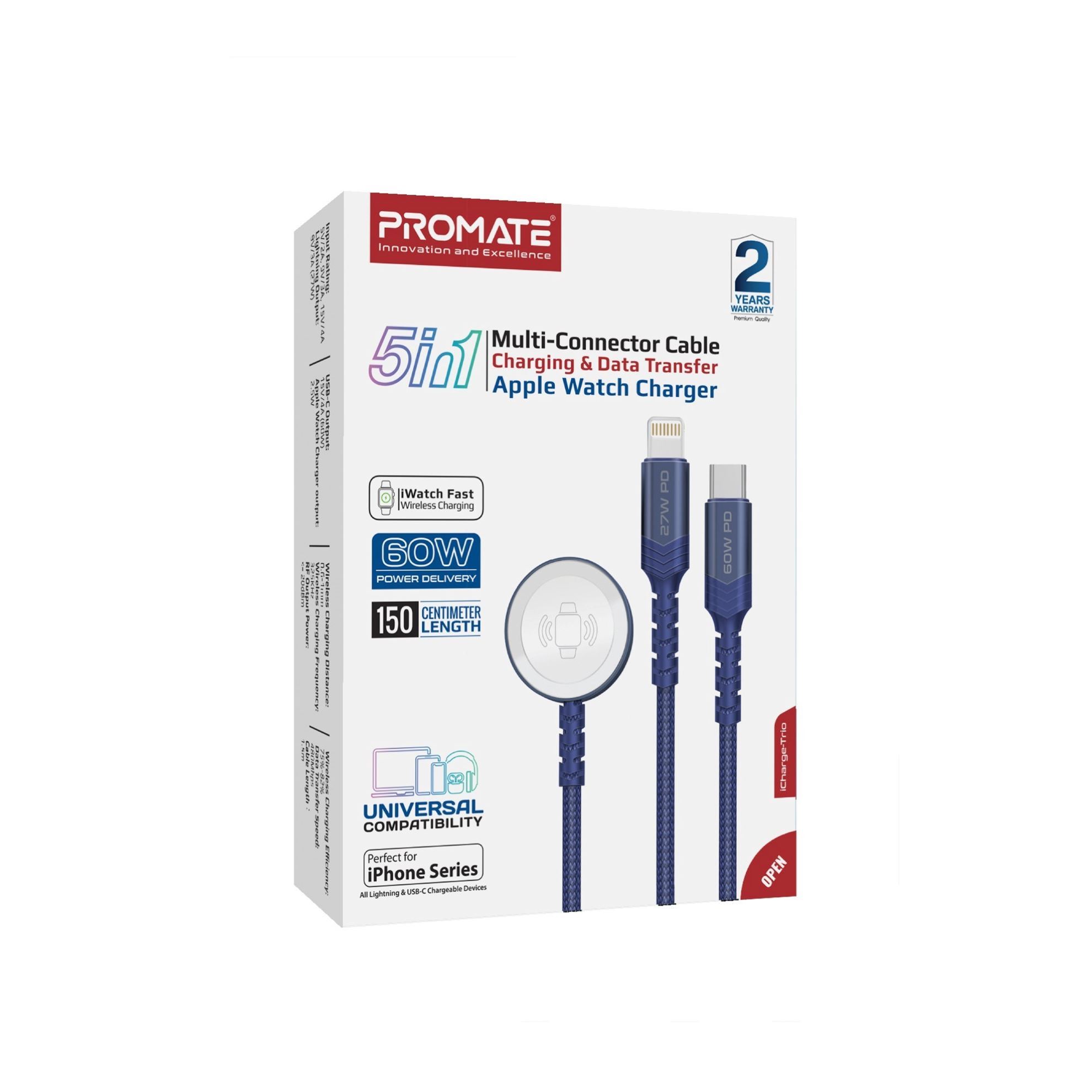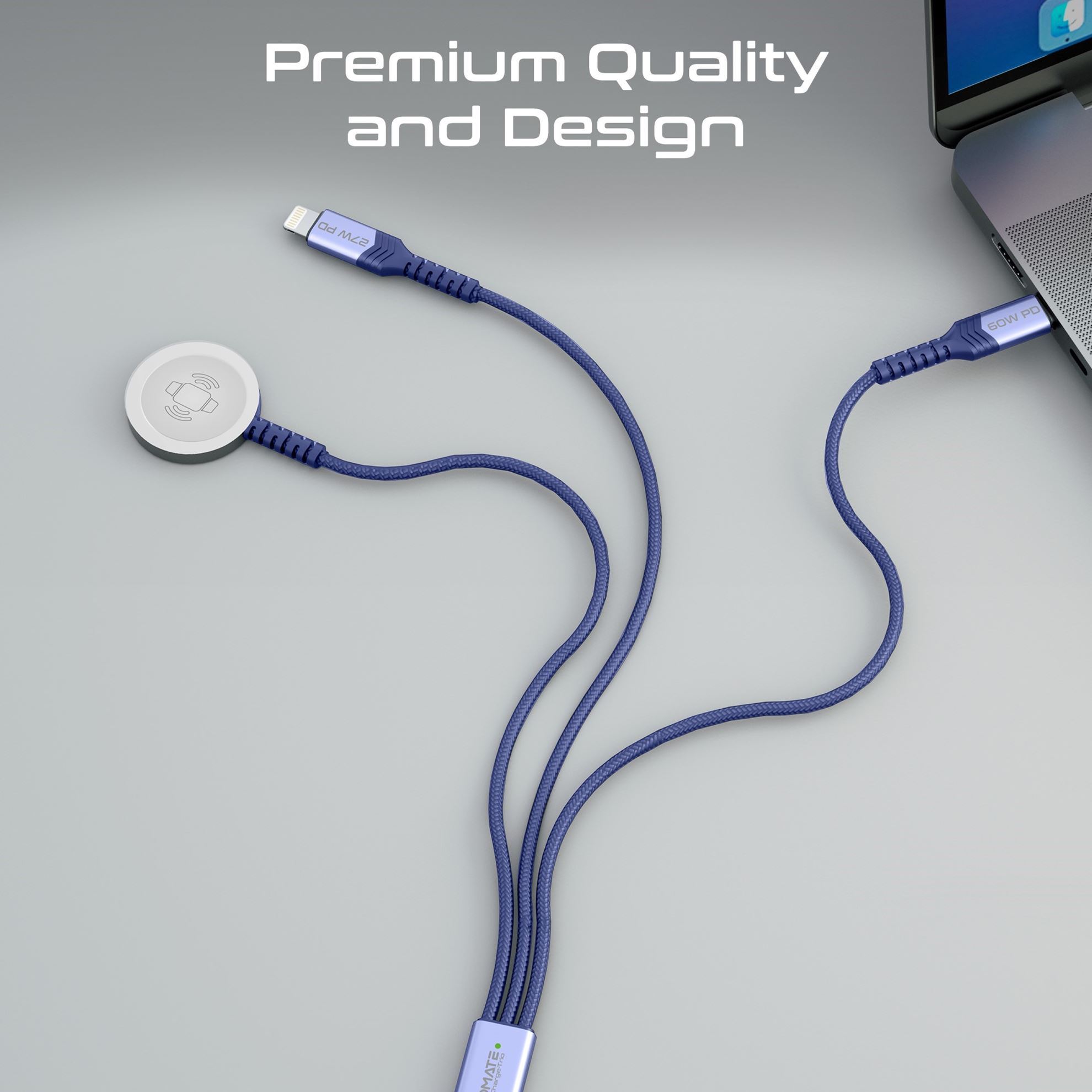 Introducing the iCharge-Trio, your all-in-one charging solution. With its versatile USB-C input and three output connectors, including Lightning, Apple Watch charger, and USB-C connector for your Apple devices and other compatible devices. simultaneous charging of multiple devices is effortless. Experience rapid charging at 60W Power Delivery while enjoying seamless data transfer at 480Mbps. The durable fabric braided cable ensures longevity and tangle-free usage, while its generous 150cm length offers flexibility. Say goodbye to cable clutter with our streamlined design, simplifying your charging experience. Elevate your style and stay powered up with the iCharge-Trio, where convenience meets innovation.