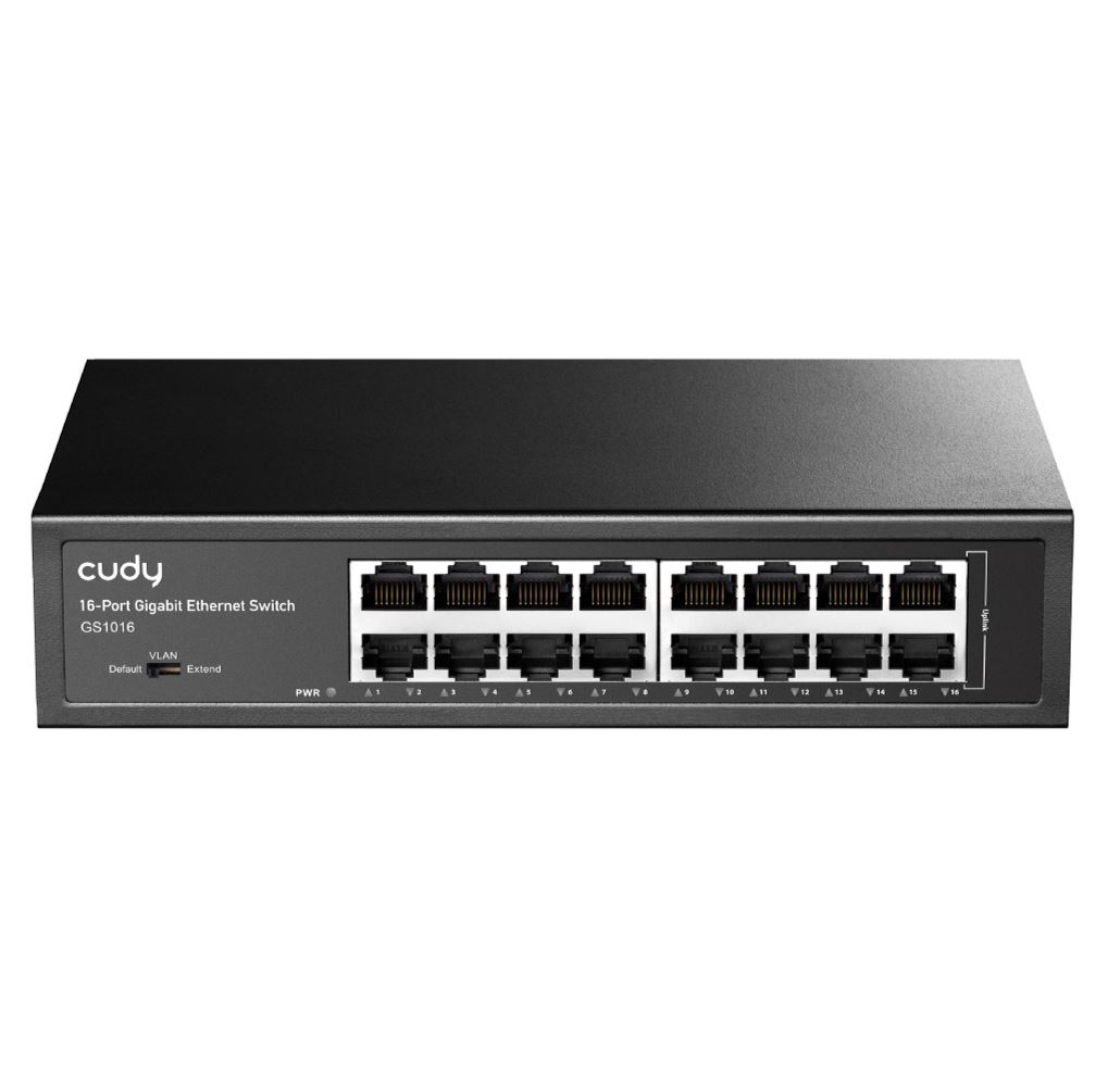 CUDY 16-Port Gigabit Unmanaged Desktop Switch in Metal Case. 16x 10/100/1000M RJ45 Ports, IGMP Snooping, Loop Detection / Prevention, 802.1p/DSCP QoS, Power Saving, Plug & Play.