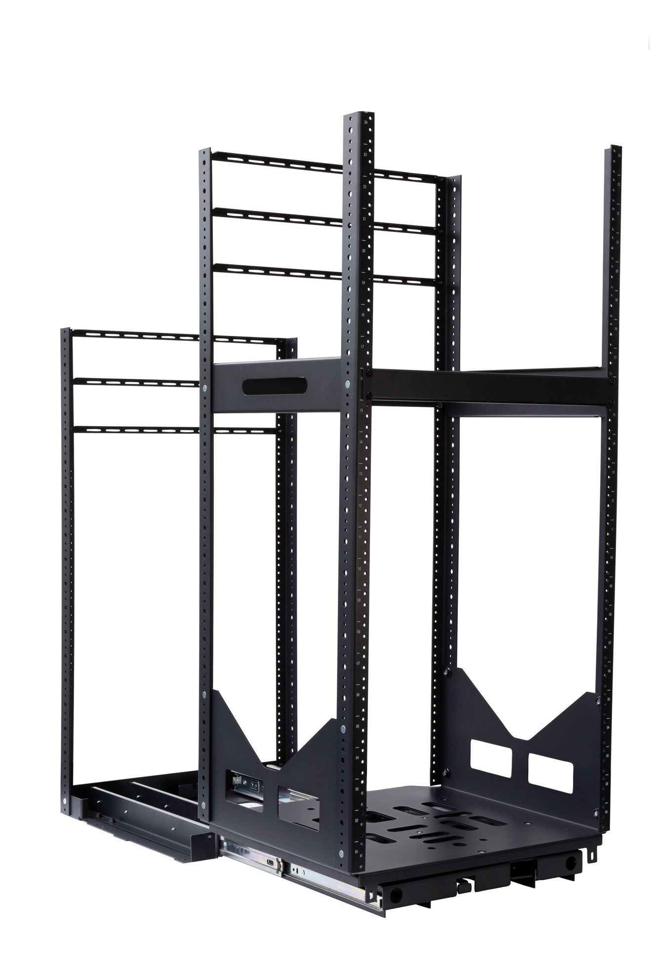 19” slide-out rotating equipment rack, ideal for in-cupboard and in-cavity installations. Rack is fixed to the floor then slides out on integrated ball bearing base and can rotate 0, 60, 90 degrees in lockable positions for convenient equipment servicing.