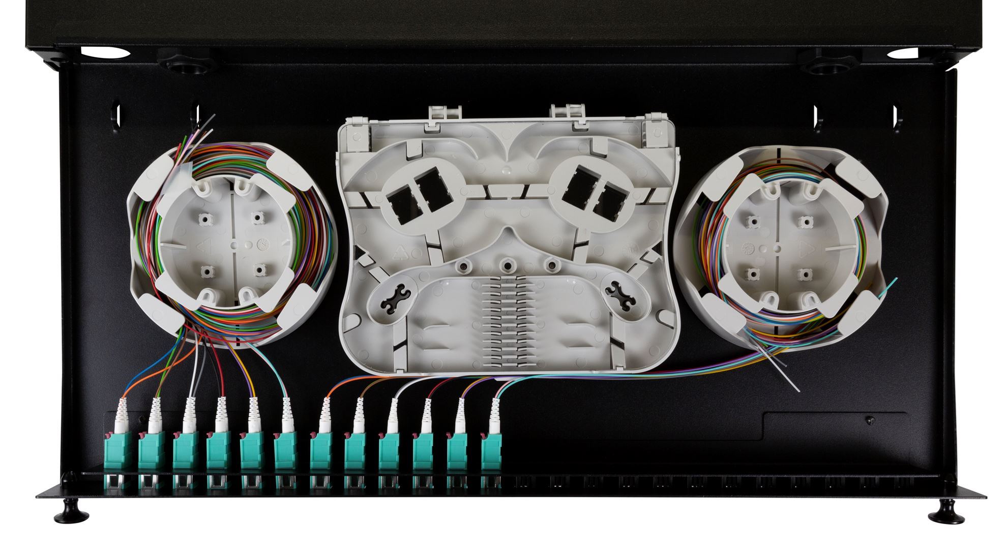 Our DYNAMIX 1U sliding patch panel is designed to accept up to 24 fibre couplers (SC/LC Duplex or LC Quad). The fibre tray is pre-loaded with 2x fibre management spools, splice cassette, 12x LC duplex aqua couplers and 24x LC OM4 Elite coloured pigtails. The splice tray has been created to distribute and protect optical fibre links in your network.