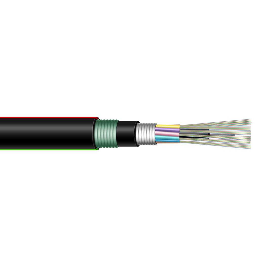 The multi loose tube cable construction consists of 2 to 96, 250μm optical fibres in 6 fibre gel filled loose tubes and fillers where appropriate, SZ stranded around a Fibre Reinforced Plastic (FRP) central strength member. Helically applied water blocking aramid non-metallic strength members. Inner black PE jacket, Corrugated Steel Tape (CST) armouring and final black PE outdoor Jacket.