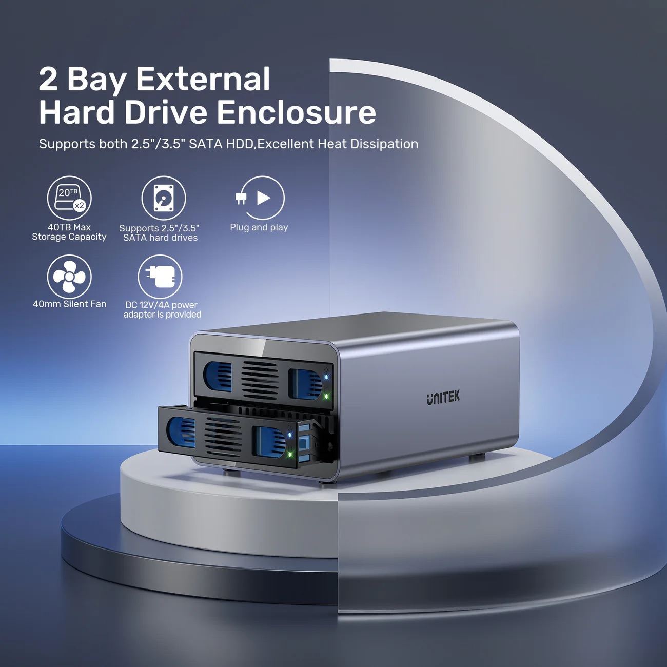 UNITEK 2-Bay SATA Enclosure is the perfect solution for those in need of a reliable and stable storage system. With up to 40TB storage capacity, this enclosure can meet a variety of work requirements. Supports both 2.5"/3.5" SATA HDD/SSD, Excellent Heat Dissipation