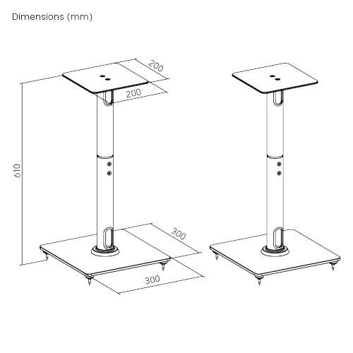 This speaker floor stand pair has an excellent weight capacity up to 25kg for each piece with a sturdy steel construction. The protective pad on the top helps to reduce unwanted resonance and ensures a clean sound. And the concealed cable management makes a neat look around your speakers. In addition, two types of base feet are included, no-slippery flat feet for solid surfaces such as hardwood and tile; and pointed nails for carpet surfaces, ensuring stability no matter where you place them.