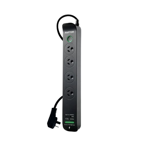 Raptor Surge Protectors have been designed in Australia to meet the high demands of today's electronic devices including Gaming, TVs, Audio and Computers. The Patented Surge protection and Fireproof MOVs built into Raptor will protect your equipment in less than 20 Nano Seconds from surges of power entering your home. The High Powered PD 30W USB-C charging port will directly charge your devices including laptops, Tablets, Gaming accessories etc. The stylish design of Raptor makes it ideal to sit on display powering and protecting your devices or sitting in the background quietly doing its job.