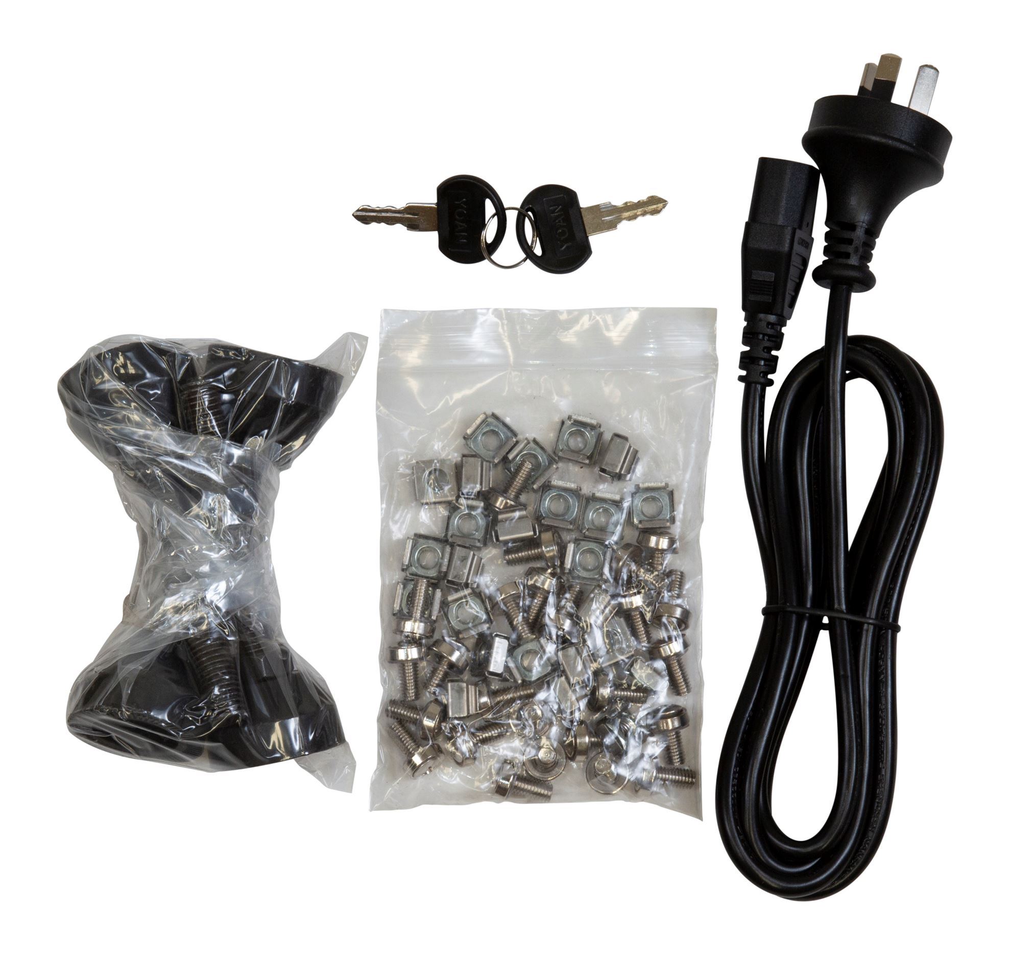 • Supplied with fixed shelves, 4x fans, 25x cage nuts, castors, levelling feet, earthing wires