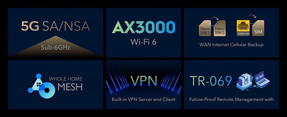 A 5G WiFi 6 router employing the 3GPP Release 16 standard, with a max 3.4 Gbps download speed. It features complete Qualcomm solutions, dual SIM slots, and a high-capacity AX3000 WiFi 6.