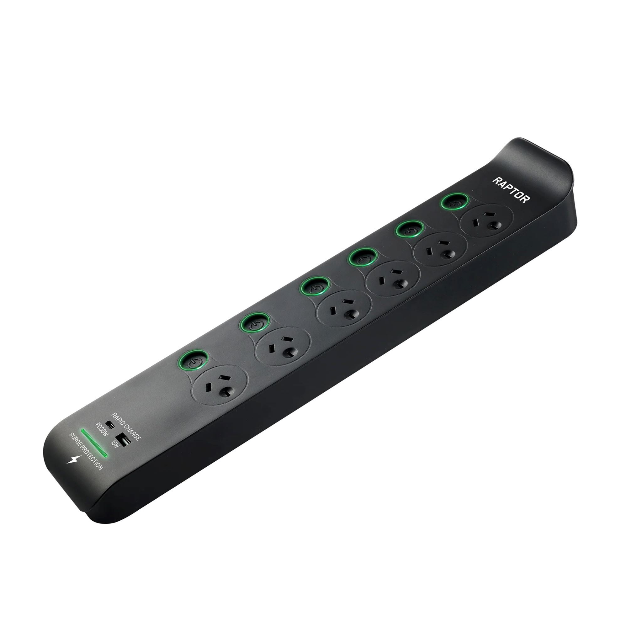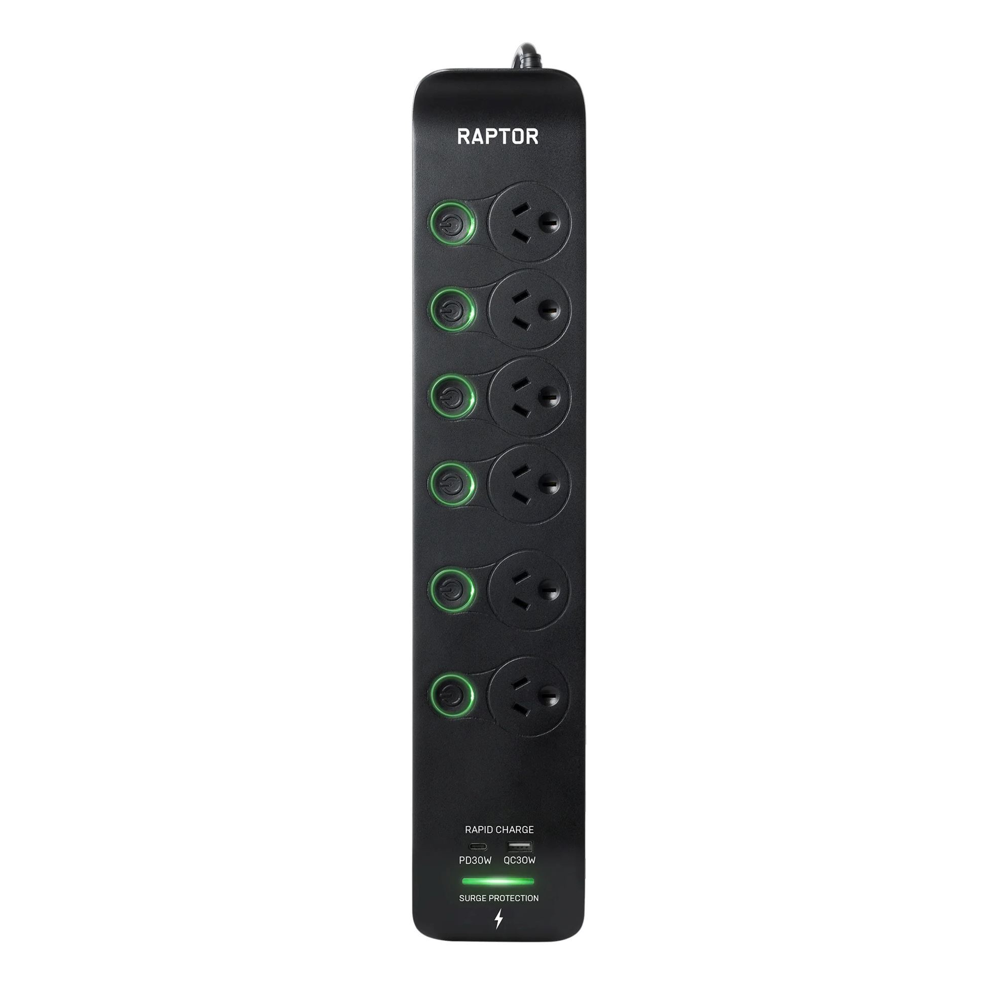 Raptor Surge Protectors have been designed in Australia to meet the high demands of today's electronic devices including: Gaming, TV's, Audio and Computers. The Patented Surge protection, and Fireproof MOV's built into Raptor will protect your equipment in less than 20 Nano Seconds from surges of power entering your home. The High Powered PD 30W USB-C charging port will directly charge your devices including laptops, Tablets, and Gaming accessories etc. The stylish design of Raptor makes it ideal to sit on display powering and protecting your devices, or sat in the background quietly doing its job.