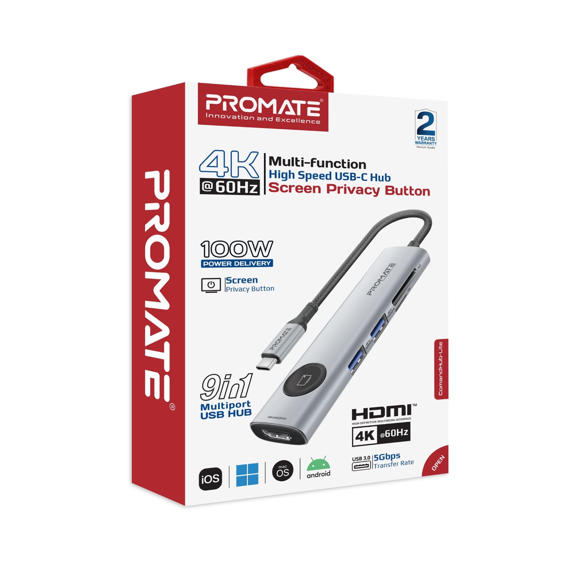 ComandHub-Lite sets a new standard in connectivity solutions. This 9-in-1 USB-C hub features an innovative HDMI Privacy Button for instant screen-off capability, dual 5Gbps USB-C and USB-A ports for high-speed data transfers, and a 100W USB-C Power Delivery Port for efficient device charging.