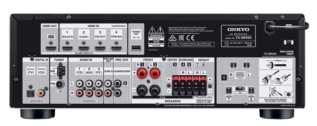 From easy Bluetooth® wireless streaming to the heart-pounding thrills of Dolby Atmos® and DTS:X® soundtracks, the TX-SR494 deepens enjoyment of daily life with great sound and smart features. Seven channels of high-current power give you the freedom to choose a speaker layout that suits you. Dolby Atmos Height Virtualizer* or DTS Virtual:X® place sound overhead or behind if you don’t want height or surround speakers and both Dolby Surround® and DTS Neural:X® are on board. Rear surrounds, bi-amped front speakers or Powered Zone B audio are also an option. AccuEQ with subwoofer EQ and AccuReflex™ for 5.2.2-ch Dolby Atmos-enabled systems clarify sound in any space. As the heart of your home cinema, the TX-SR494 has HDMI® terminals supporting HDR and 4K/60p video, while the GUI with OSD over HDMI, Zone B pre-/line-out, and Vocal Enhancer function make this receiver a joy to use as well as hear.