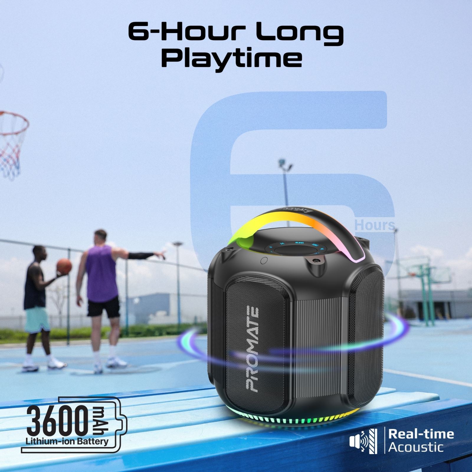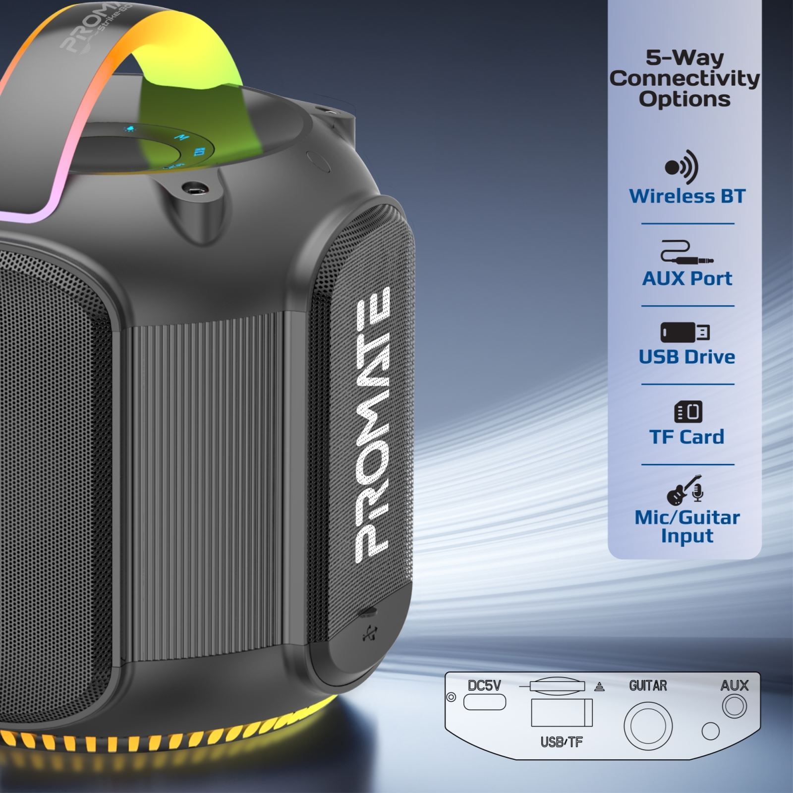 Strike-80 by Promate brings immersive sound and stunning visuals together in one dynamic speaker. Delivering 80W of stereo sound, this high-fidelity TWS-compatible speaker offers an exceptional listening experience. With 6 hours of playtime and a 3600mAh lithium-ion battery, it keeps the music going longer, while the 12 hours of standby time ensures it's always ready. Enjoy versatile connectivity with five audio playback options, including a TF card, USB drive, AUX, and even a 1 / 4” guitar port. The vibrant RGB lights set the mood with five dynamic modes, while the built-in handle with RGB lights adds a touch of style and portability. IPX5 water resistance makes it perfect for outdoor adventures, and quick music navigation keeps you in control.