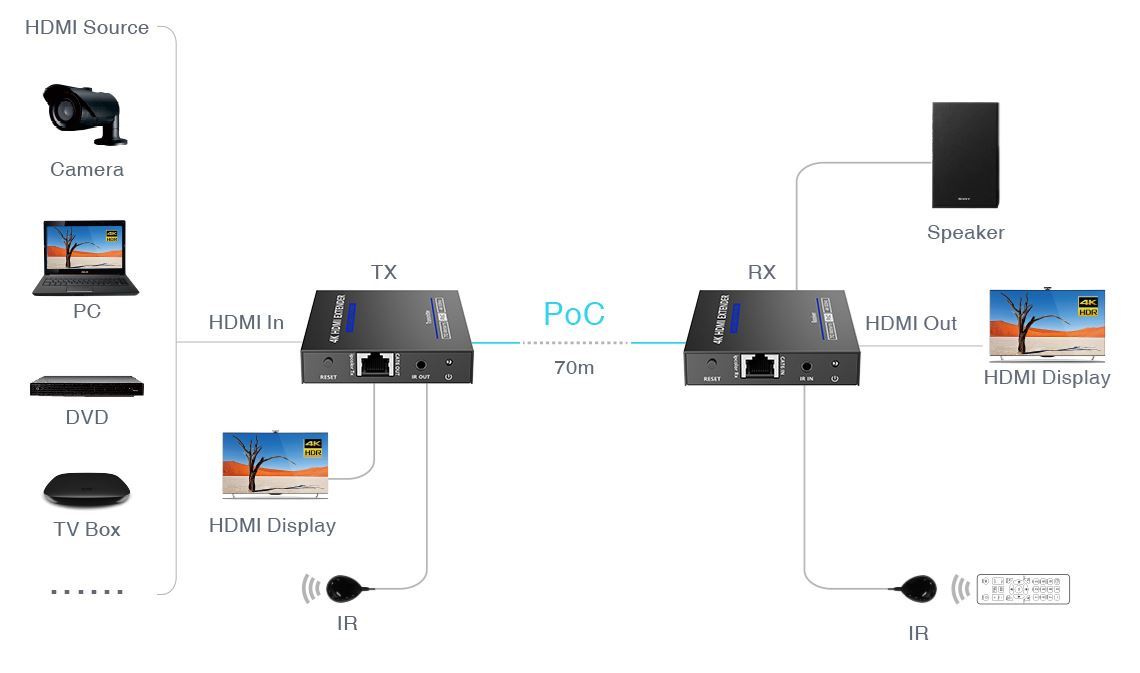 This is an HDMI point-to-point extender kit, it can realize zero-latency transmission. The 4K@60Hz HDMI signal can be extended by 70m through CAT6/6A/7 network cable. It supports HDMI loop out, IR passthrough, 3.5mm audio output, etc. This kit is a reliable, ultra-high-definition video transmission solution, which is widely used in security monitoring, home theatre, broadcasting, training and other fields.