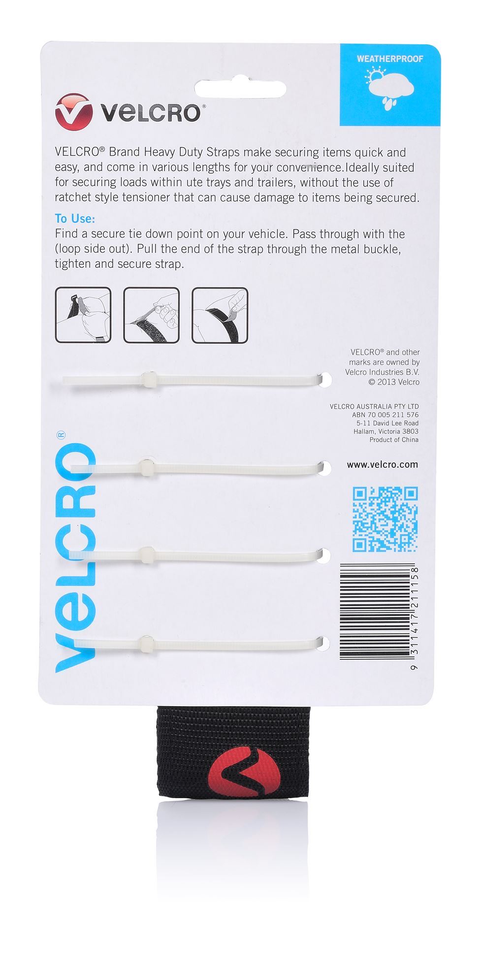 VELCRO® Brand Heavy Duty Tie Down Straps are the fast, safe and reliable way to secure your load in transit. Get your gear from A to B in one piece without the need for knots, ropes, elasticised hook straps or ratchet-style tensioners. Use them to tie down furniture, luggage, camping gear, wheelbarrows, pipes and other large equipment in the back of your ute or trailer. Water-resistant and UV stabilised, they are durable and long-lasting and designed for repeated outdoor use. Can be used to secure large and bulky items, equipment and furniture up to 150kg.