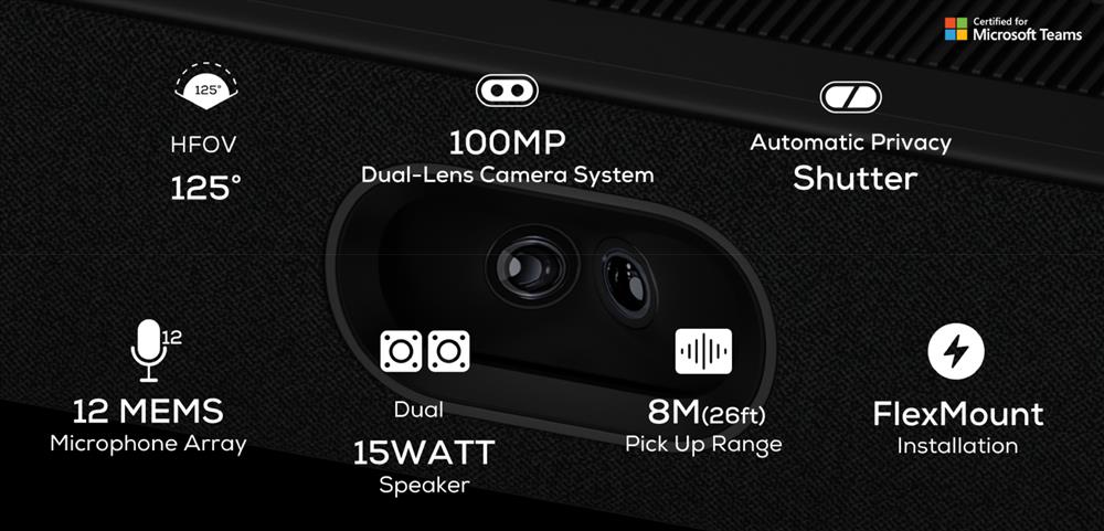 A Teams-certified MDEP Android videobar with a 100MP dual-lens camera system and FlexMount-ideal for small to medium rooms.