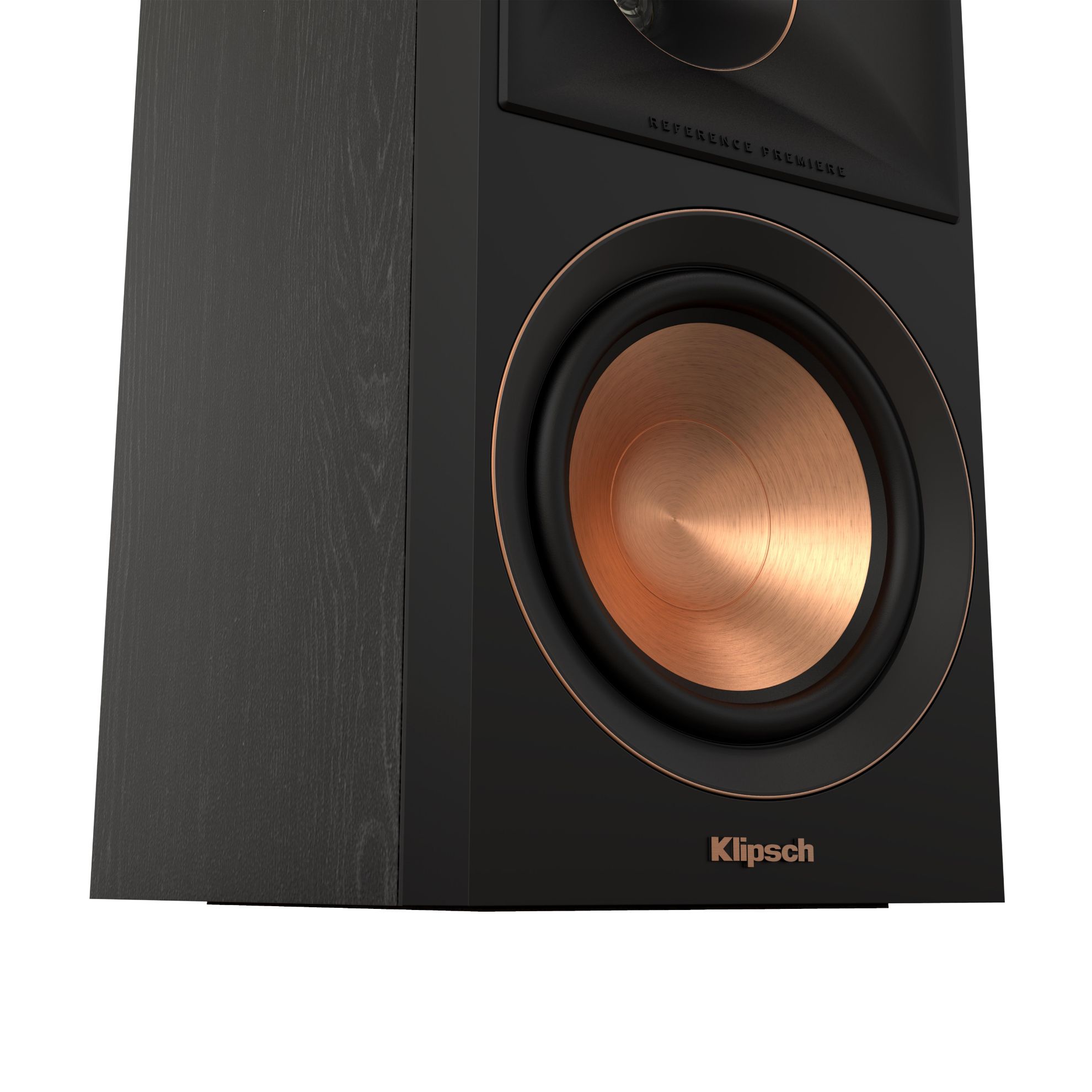 Klipsch bookshelf speakers feature a 5.25" Cerametallic woofer and 1" titanium tweeter with Tractrix® horn, delivering 50Hz–25kHz frequency response, 92dB sensitivity, and 75W continuous (300W peak) power handling. Built with a rear-ported, braced MDF enclosure and ebony finish.