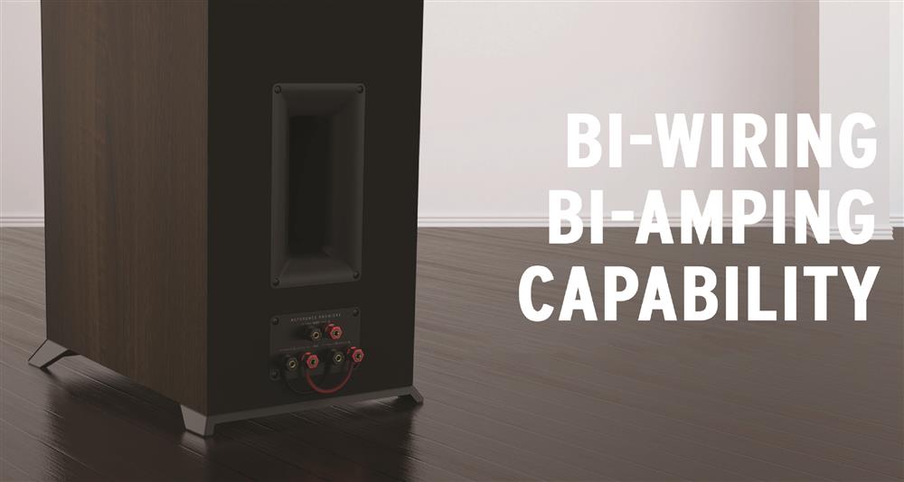 Dual input terminals for bi-wiring / bi-amping capabilities. Bi-wiring separates high and low frequency current into separate speaker cables, reducing intermodulation distortion for clearer midrange. Bi-amping allows for customisation using outboard crossovers when using separate amplifiers.