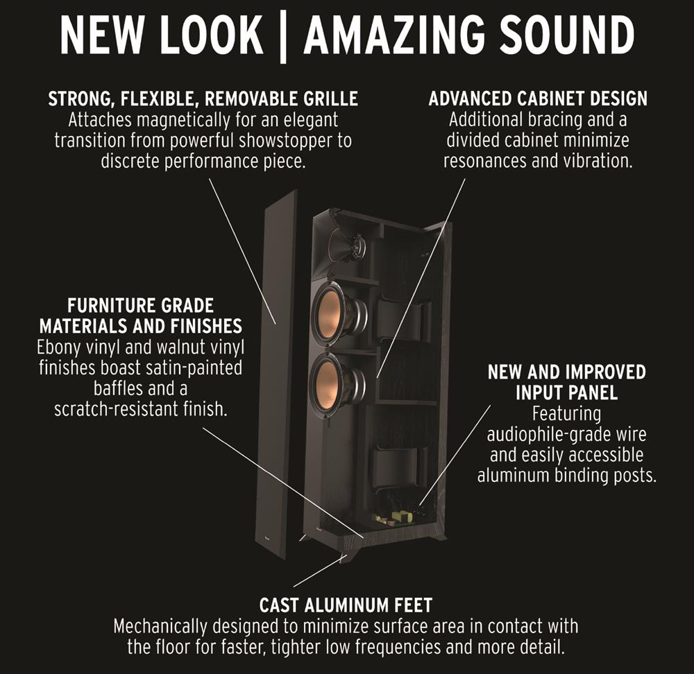 Finishes include ebony vinyl and walnut vinyl that boast satin-painted baffles with a scratch-resistant finish.