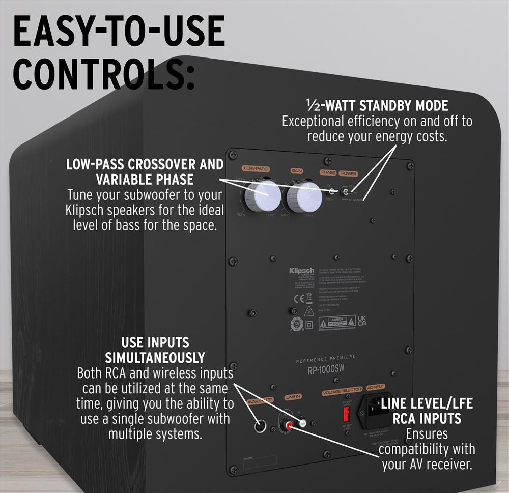 Low Pass Crossover and Variable Phase control allow you to tune the subwoofer to your Klipsch speakers and to your room, establishing the ideal level of bass. Line Level / LFE RCA inputs ensure compatibility with home theatre receivers.
