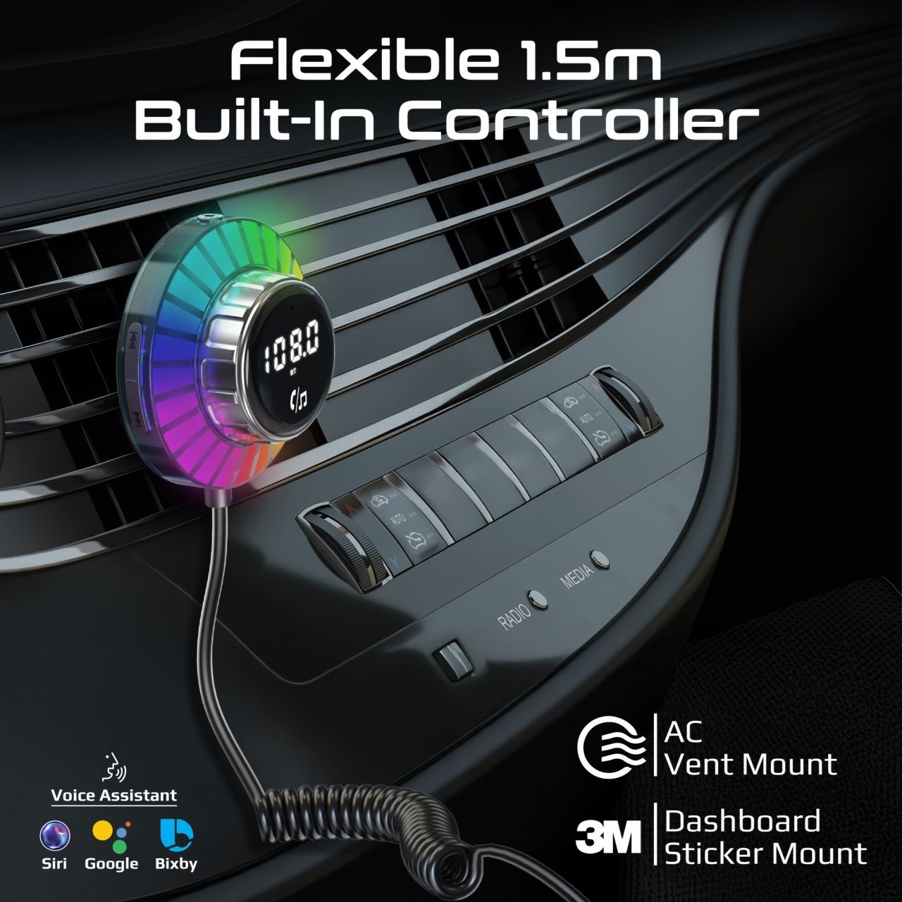 Transform your driving experience with Promate’s SmarTune-EXT, the ultimate car FM transmitter that combines power, style, and convenience. Enjoy seamless music streaming and hands-free calling with Bluetooth V5.3 for stable and reliable connections. The high-powered PD30W USB-C and rapid 18W Quick Charge 3.0 ports keep your devices charged at lightning speed, while the 1.5m built-in controller effortlessly mounts to AC vents or dashboards for total control at your fingertips. Vibrant RGB lights add a dynamic flair to your car interior, while the built-in mic ensures crystal-clear conversations on the go. Designed with a comprehensive multi-protection system, SmarTune-EXT guarantees safe and worry-free use, making every drive smarter, safer, and more exciting.