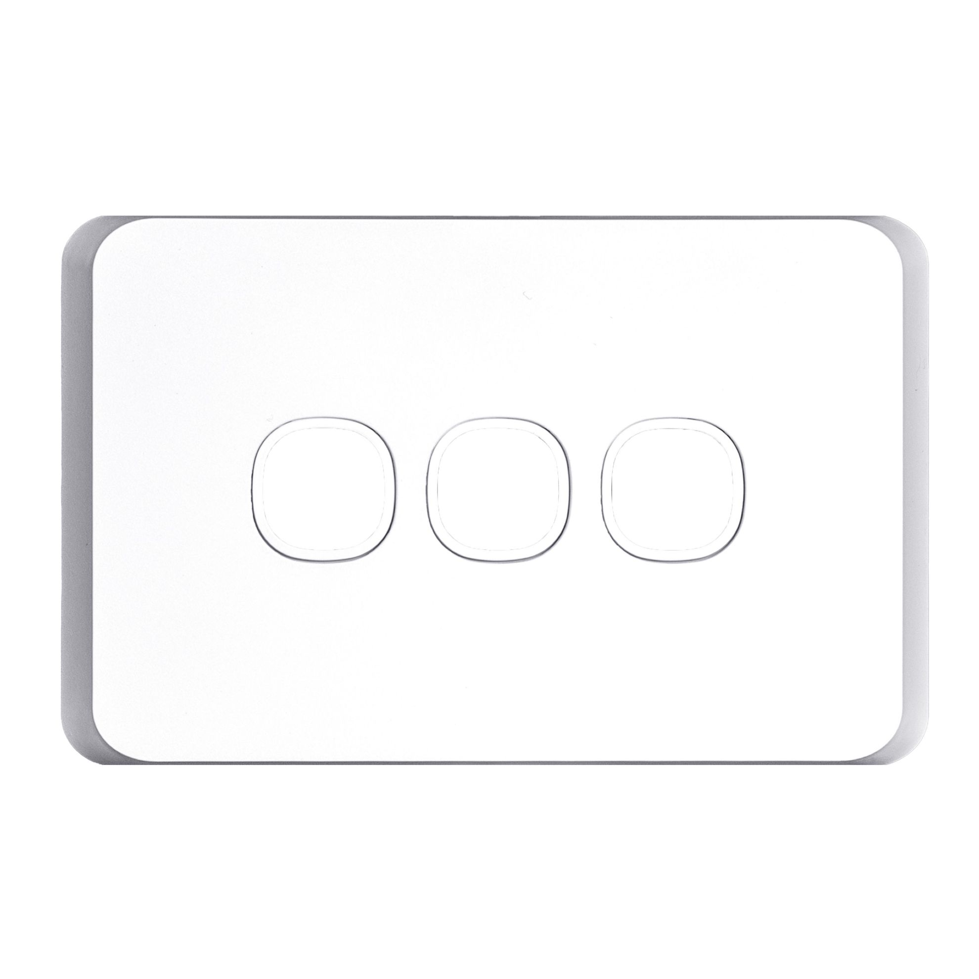 TRADESAVE Sleek 3 Gang Switch Plate ONLY. Accepts all Tradesave Mechanisms. Moulded in Flame Resistant Polycarbonate. Fade Resistant. Matt White