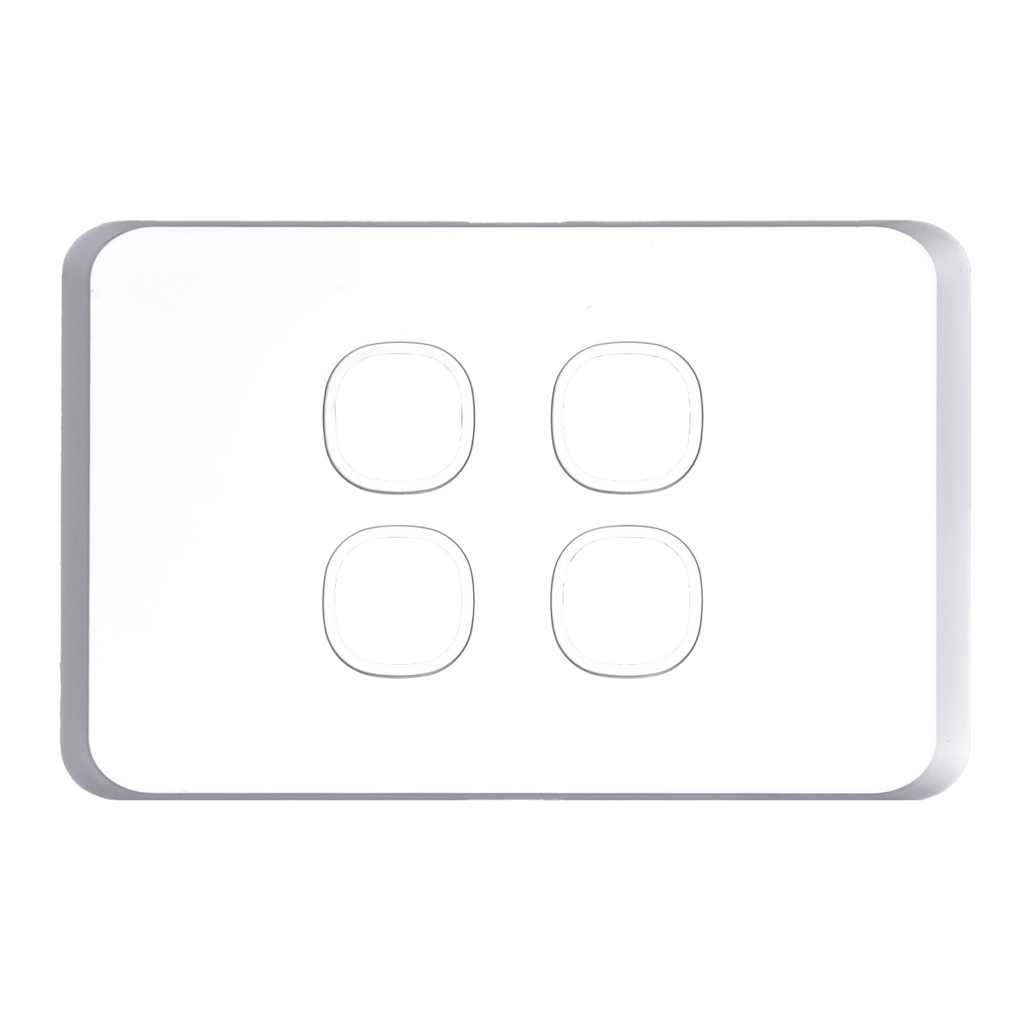 TRADESAVE Sleek 4 Gang Switch Plate ONLY. Accepts all Tradesave Mechanisms. Moulded in Flame Resistant Polycarbonate. Fade Resistant. Matt White