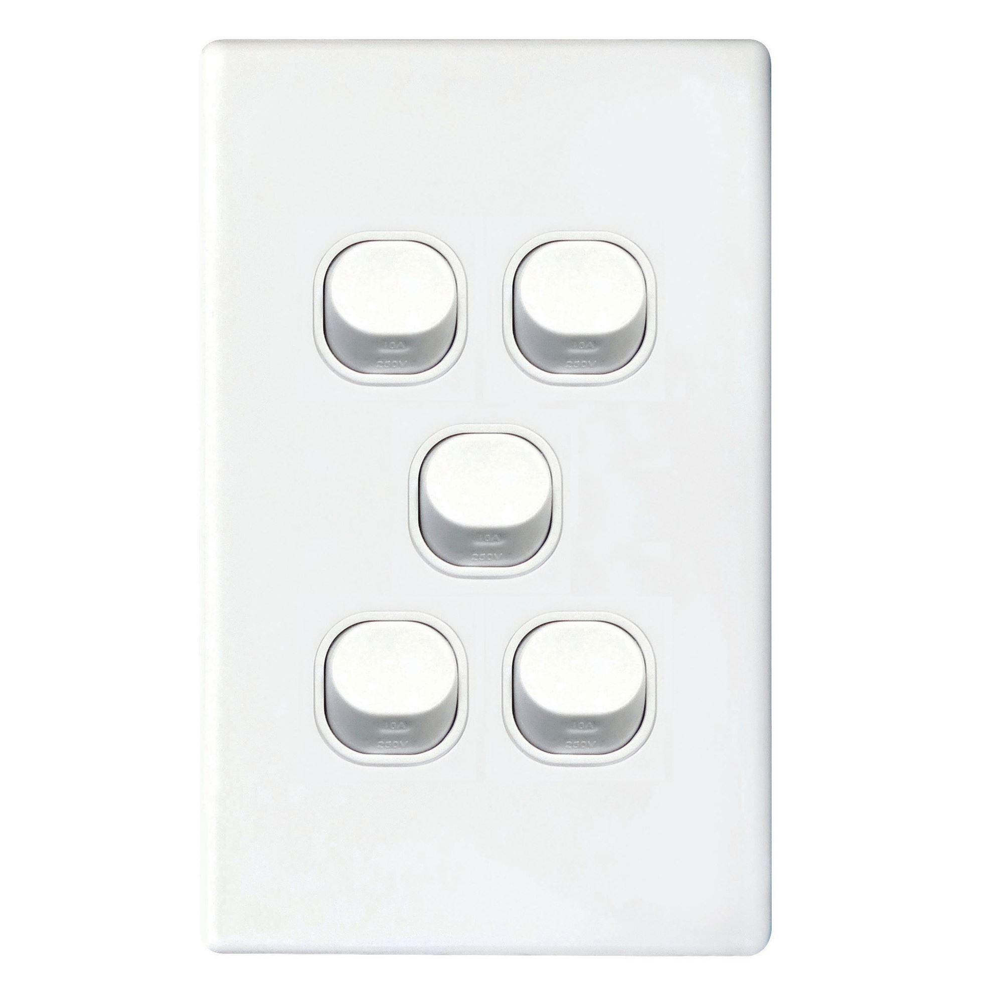 Slim 16A 2-Way Vertical 5 Gang Switch. Moulded in Flame Resistant Polycarbonate. Fade