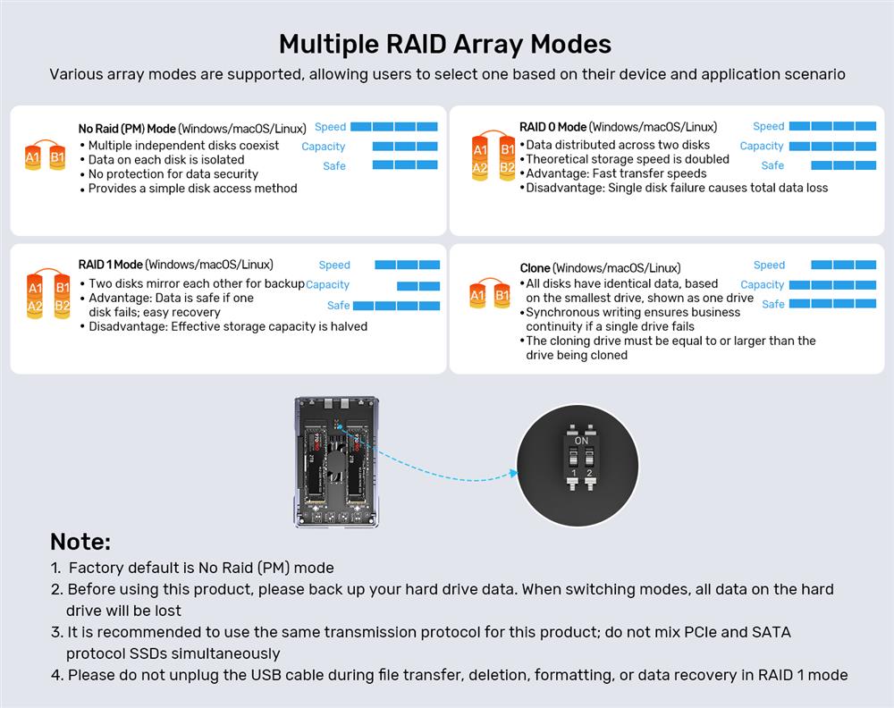 - 4 Storage modes: Includes PM, RAID 0, RAID 1, and Offline Clone modes. After setting your desired RAID mode using the SW1/SW2 switches, press and hold the RESET button for 3 seconds to activate the storage mode.*