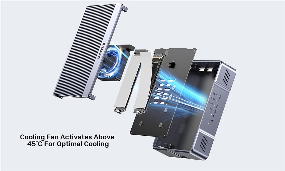 - Comprehensive Cooling System: The cooling fan activates automatically when the temperature exceeds 45°C. The built-in cooling fan and heat dissipation holes in the aluminium alloy housing ensure optimal heat dissipation, providing stable and smooth data transfers.