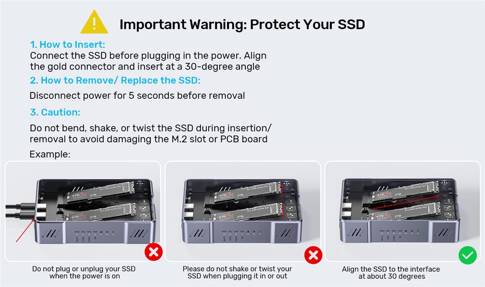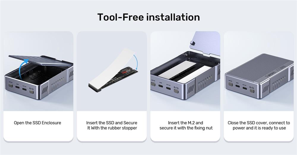 - Stable Performance: Supports external 5V2A power supply via the USB-C DC5.0V port with a 1m USB-C to USB-A charging cable (included). This enhances stable performance for the M.2 SSD enclosure.
