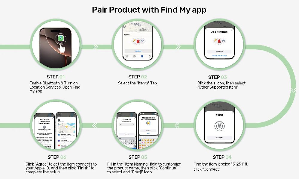 Follow these simple steps to connect your SolidForce enclosure to the Find My app and enable tracking: 1. Enable Bluetooth & Location Services, then open the Find My app. 2. Go to the "Items" tab. 3. Tap the + icon and select "Other Supported Item". 4. Find and select "S1251" from the list, then tap "Connect". 5. Name your item and choose an emoji icon, then tap "Continue". 6. Agree to connect to your Apple ID and tap "Finish" to complete setup.