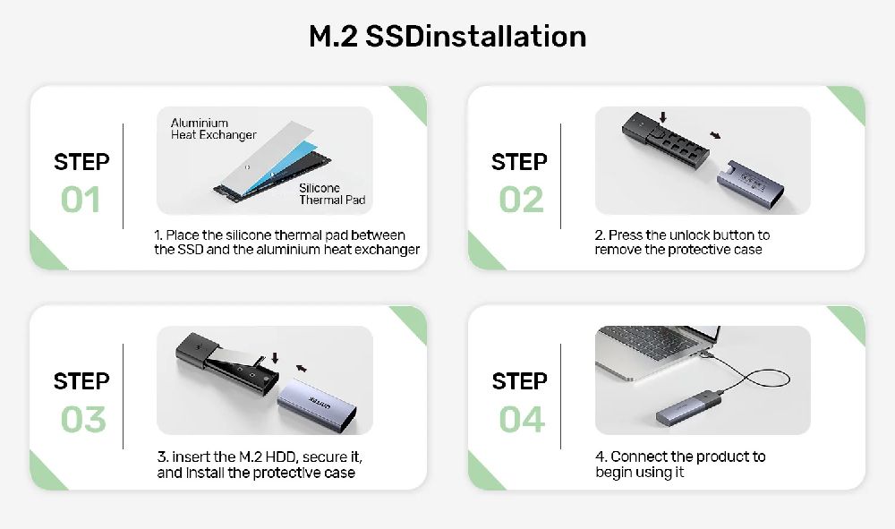 Follow these four easy steps to install your M.2 SSD into the enclosure: