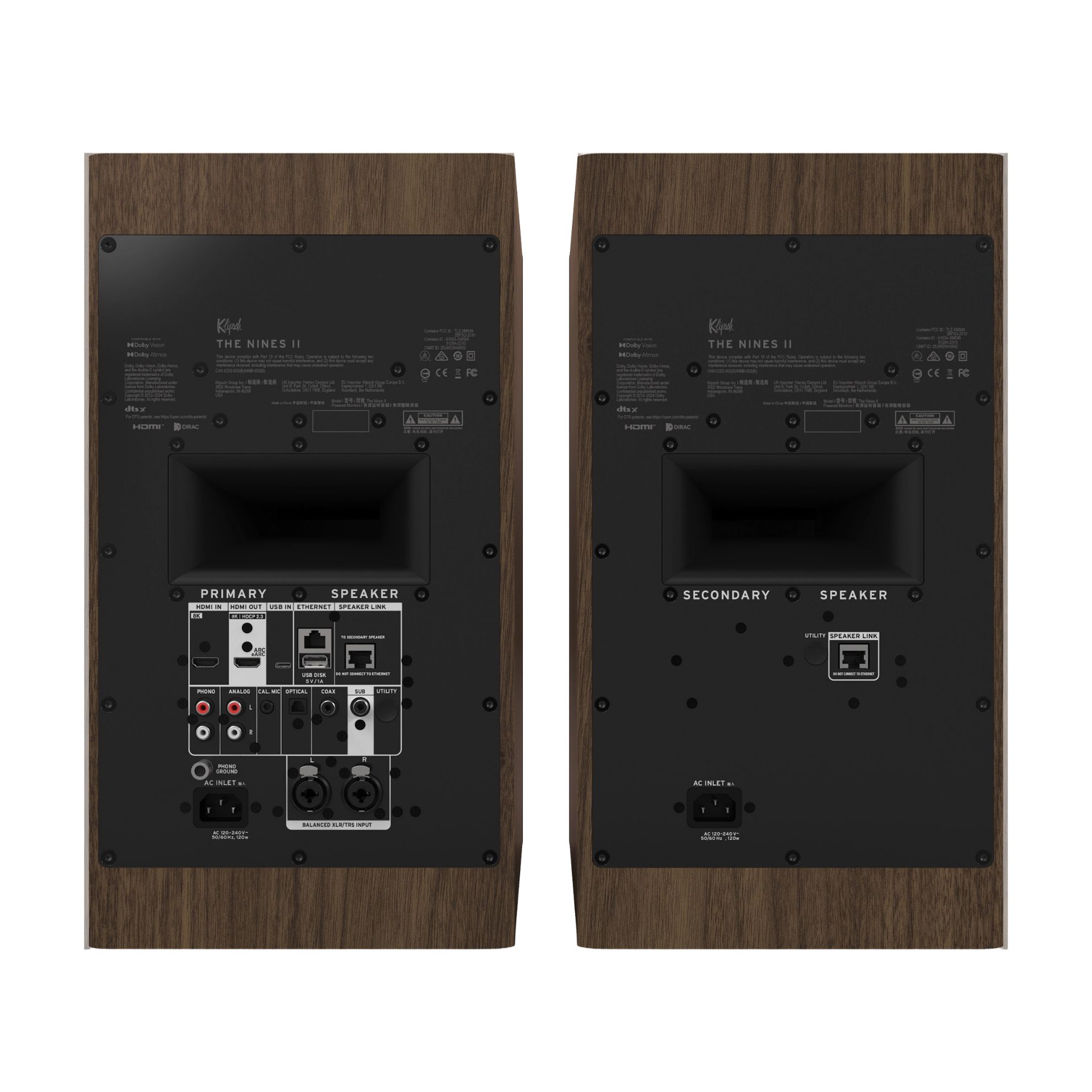 Klipsch powered speakers feature an 8" Cerametallic™ woofer and 1" titanium LTS tweeter with Tractrix® horn, delivering 31Hz–25kHz response, 96kHz/24-bit audio, and up to 107dB output. They support HDMI 2.1 with eARC, Wi-Fi and Ethernet networking, Bluetooth 5.4, Dolby Atmos® virtual height playback, and multiple digital and analog inputs, housed in a rear-ported MDF enclosure with genuine walnut veneer.