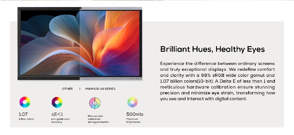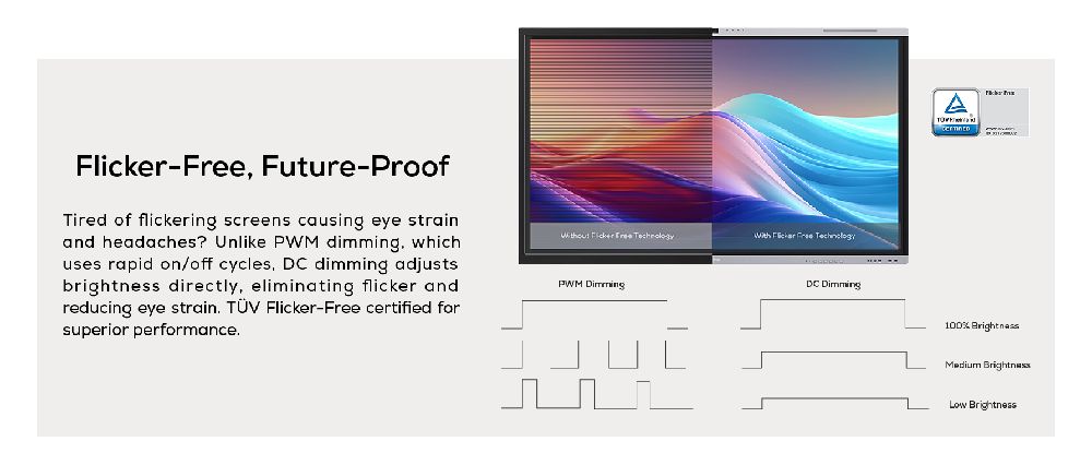 - Classroom Care: Hardware-grade eye care, TÜV Low Blue Light, and Flicker Free certification