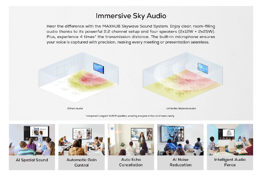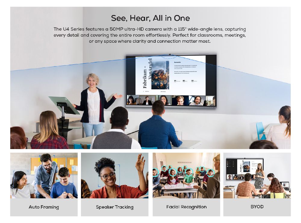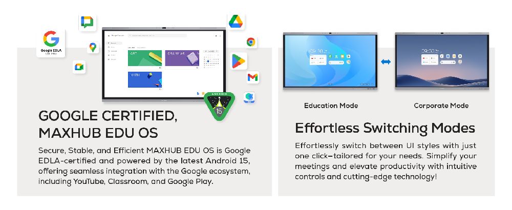 The MAXHUB U7540 is a versatile solution for both education and collaborative discussions. Equipped with a Google EDLA Certified operating system, it ensures seamless integration with Google apps and accounts, while the AI-powered SoC ensures smooth performance. The advanced touchscreen enables precise writing, and the powerful AI camera and microphone deliver clear audio and video for seamless interactions. With versatile connectivity options, it simplifies content sharing and enhances collaboration, making it an ideal tool for productive and engaging communication.