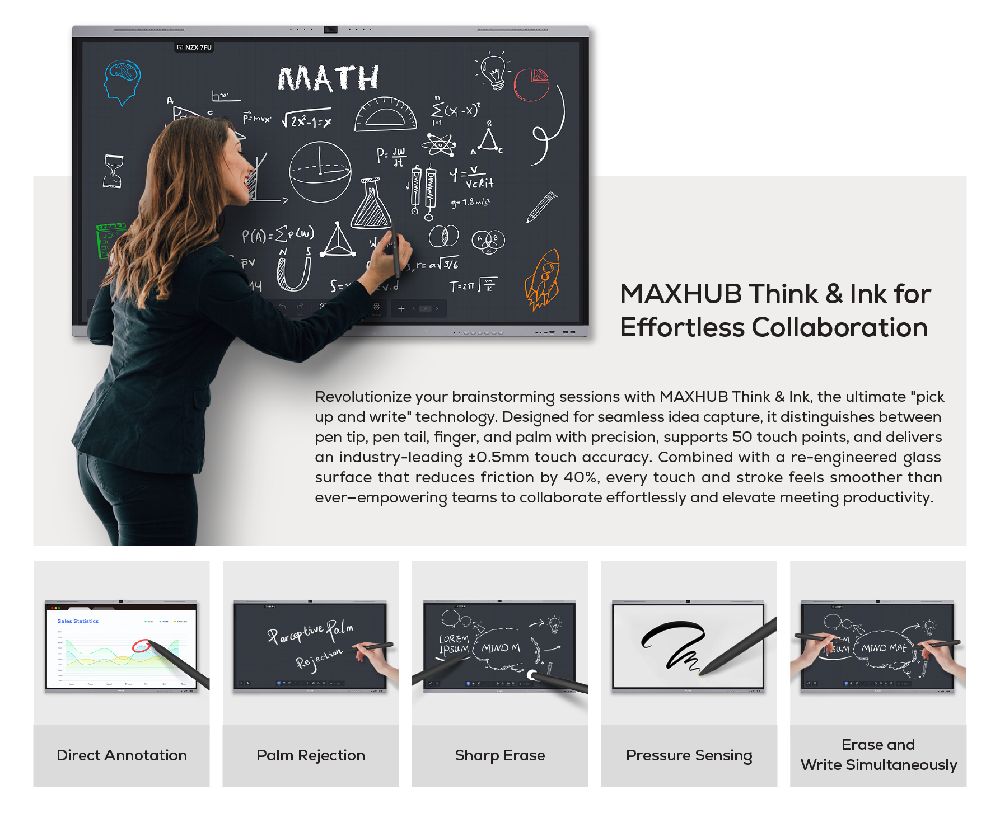 - Precious Touch: MAXHUB Think&Ink Technology 50 touch points ± 0.5mm touch accuracy