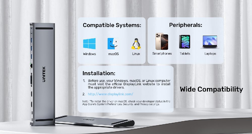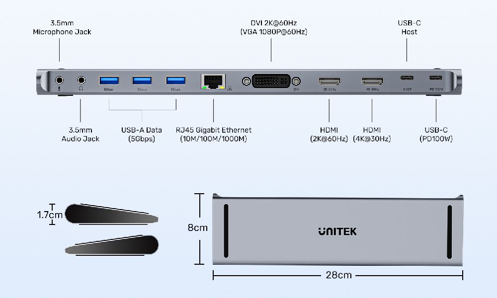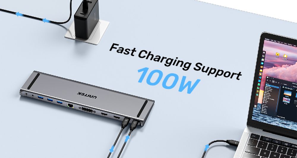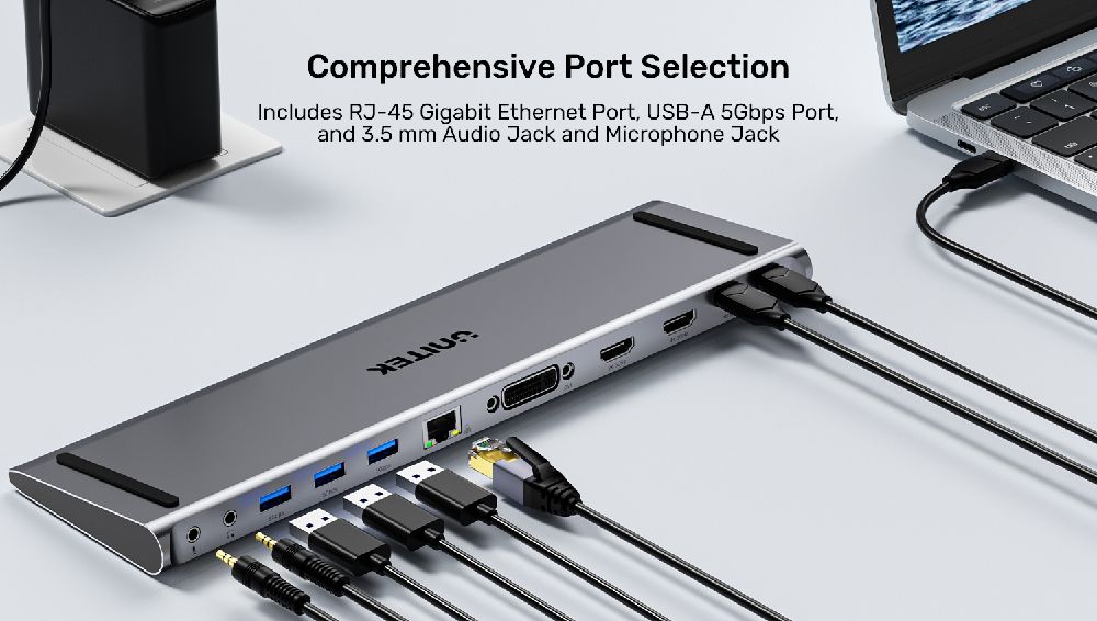 The UNITEK uHUB11+ USB-C DisplayLink 4K Docking Station enhances productivity with triple display outputs (up to 4K@30Hz), 5Gbps USB-A ports, 100W PD charging, and Gigabit Ethernet. It includes audio/mic jacks and supports Windows/macOS. Perfect for office work, entertainment, and creative tasks, this versatile hub ensures seamless connectivity and fast performance for laptops or tablets in any scenario.