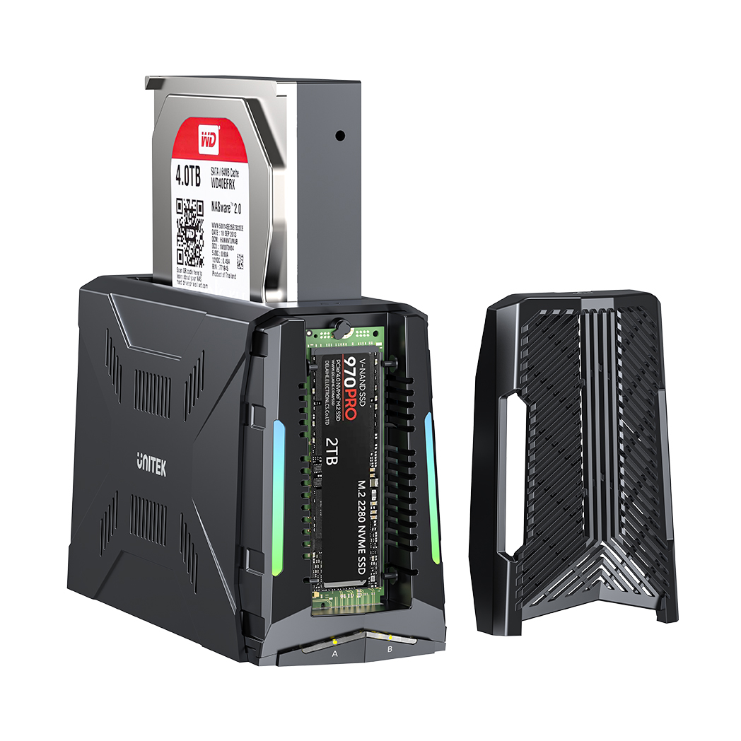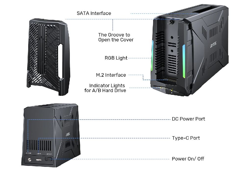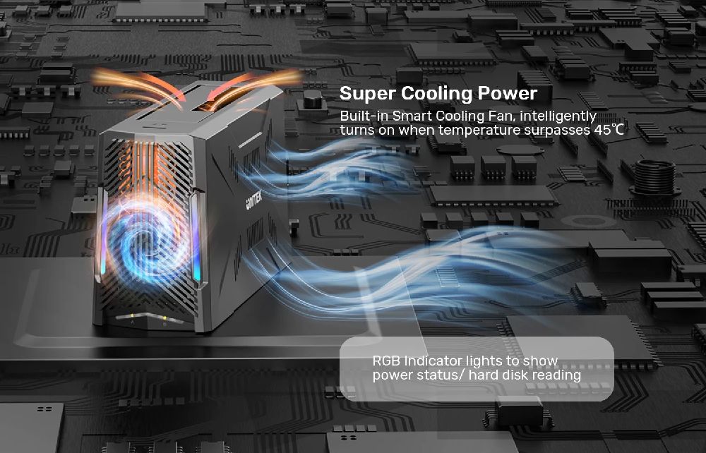 Supporting a range of activities, including transferring data with ease, playing games with high-speed access to 2.5”/3.5” SATA SSDs/HDDs and M.2 PCIe SSDs, and watching movies with reliable performance. Its dual-drive mode and 10Gbps speed, paired with intelligent cooling and RGB LED lights, make it a versatile solution for work and leisure.